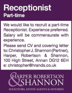 100 High Street, Annan, Dumfriesshire | Main Office Tel: 01461 203418 | Estate Agency Tel: 01461 207540|office@hrands.co.uk