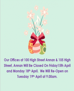 Our Offices Will Be Closed On Friday 15th April & Monday 18th April By Leanne|2022-04-14T15:34:29+01:00April 14th, 2022|Uncategorised|Comments Off on Our Offices Will Be Closed On Friday 15th April & Monday 18th April Share This Story, Choose Your Platform! FacebookXRedditLinkedInWhatsAppTumblrPinterestVkEmail Related Posts Spring Bank Holiday Notice – Monday 4th May Gallery Spring Bank Holiday Notice – Monday 4th May April 27th, 2026 Albie Cottage, Waterbeck – Virtual Tour Added With Floor Plan – Price Review Too! Now – £198,000 (Negotiable) Gallery Albie Cottage, Waterbeck – Virtual Tour Added With Floor Plan – Price Review Too! Now – £198,000 (Negotiable) April 24th, 2026 New On The Market For Sale Gallery New On The Market For Sale April 22nd, 2026 New On The Market For Sale Gallery New On The Market For Sale April 22nd, 2026 Stratton, Calverley Place, Eastriggs – For Sale With No Onward Chain Gallery Stratton, Calverley Place, Eastriggs – For Sale With No Onward Chain April 22nd, 2026