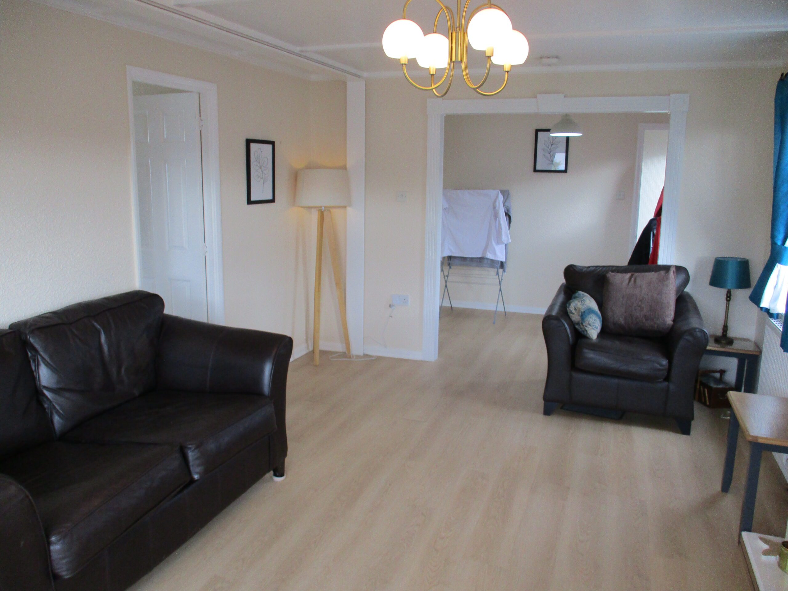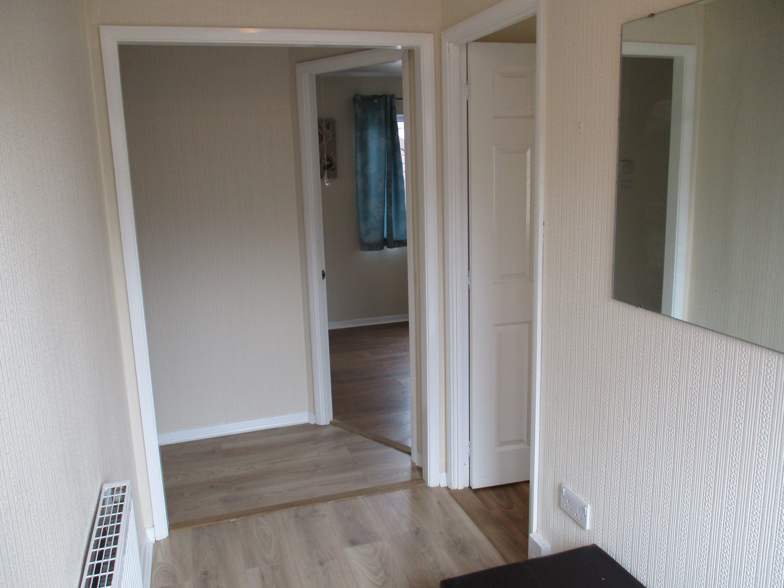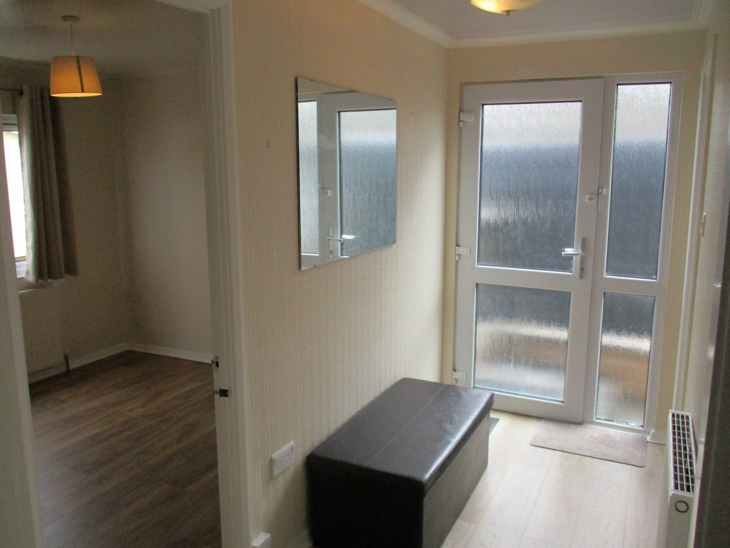 Entered through an obscured part glazed U.P.V.C door with obscured side panel. PV.C. Ceiling. Two ceiling lightshades. Smoke alarm. Coat hooks. Central heating thermostat. Laminate flooring. Radiator with thermostatic valve. Doors off to lounge, dining area, two bedrooms and bathroom.