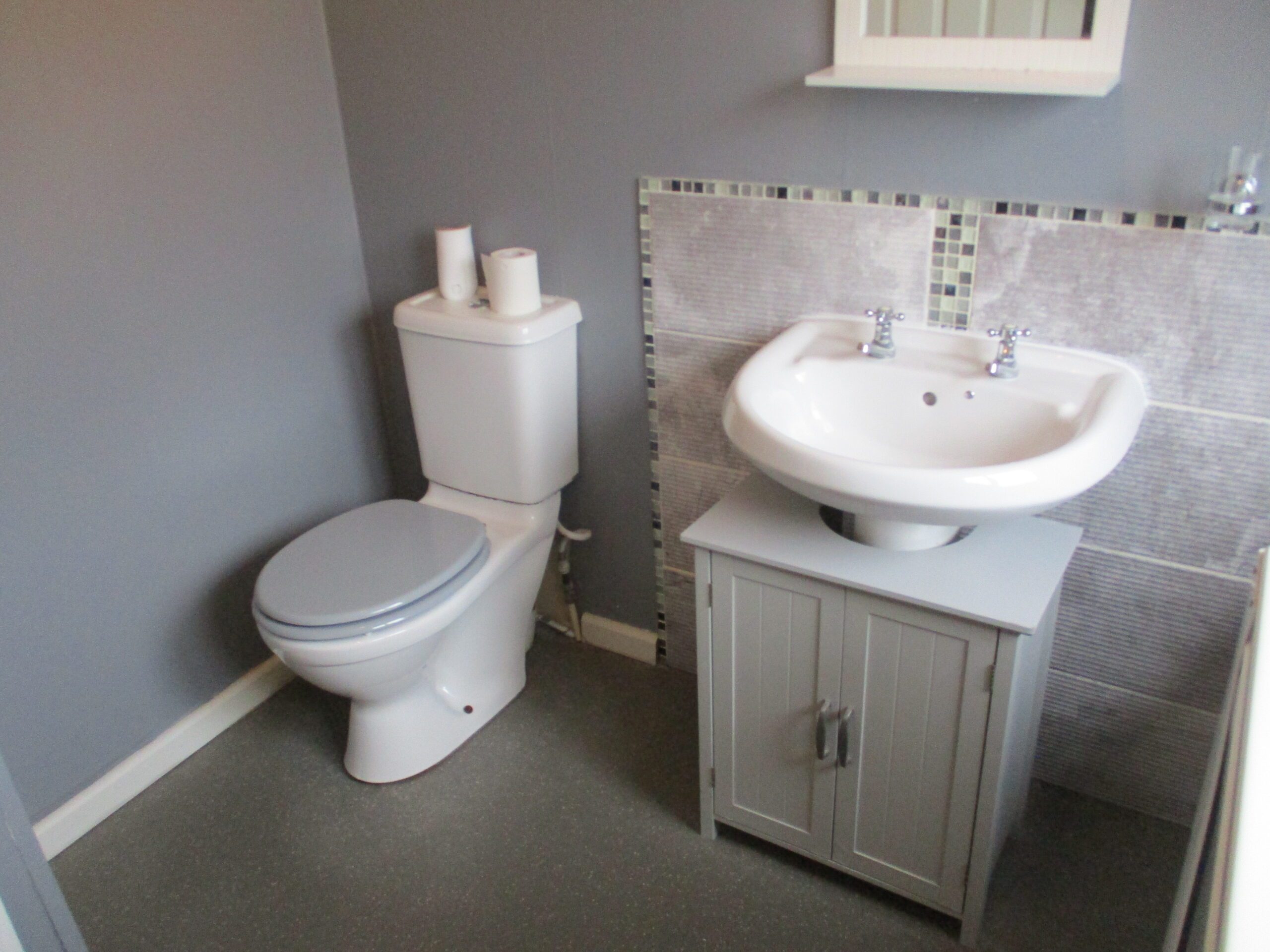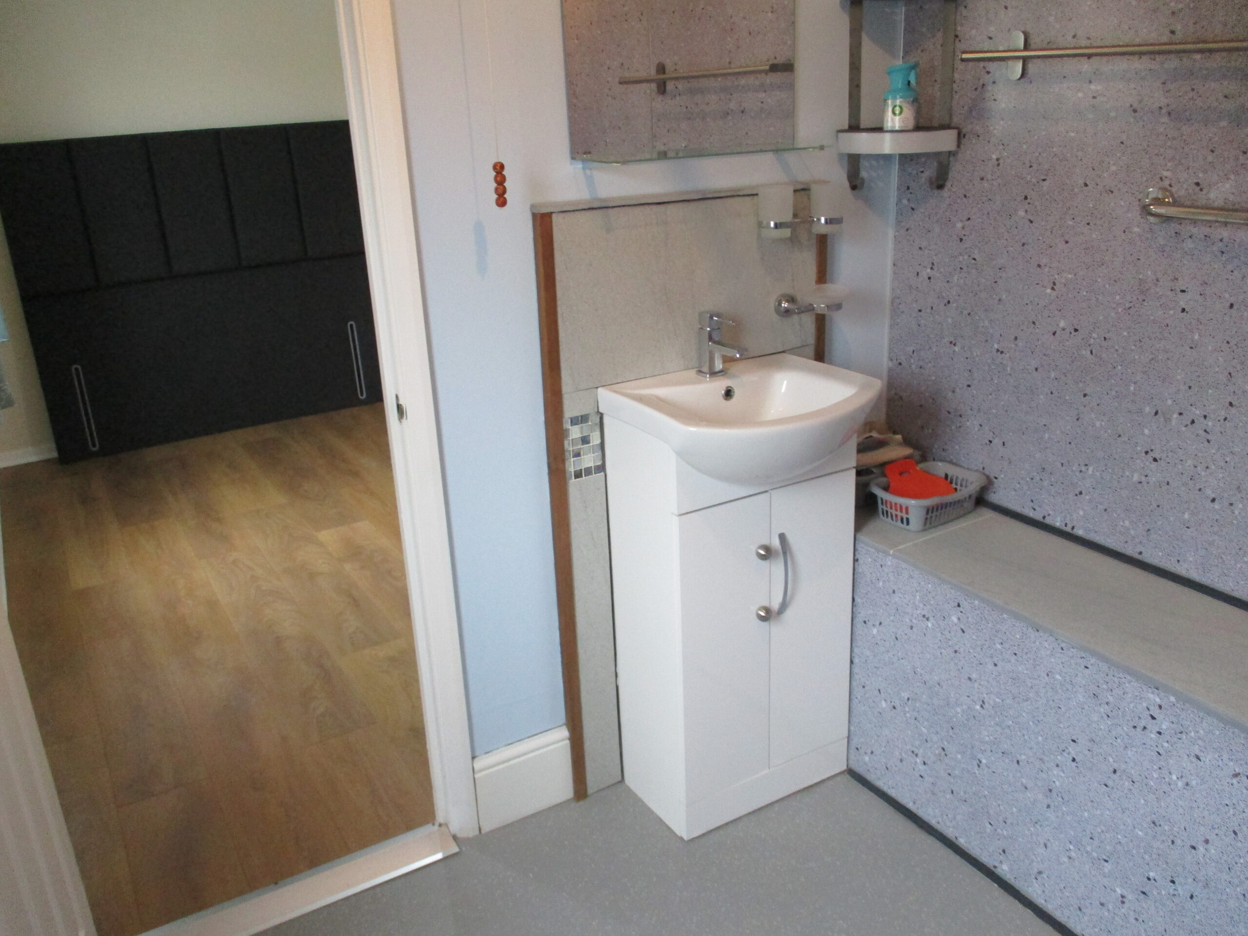 White wash-hand basin with chrome single lever mixer tap and storage unit underneath. W.C. Walk-in shower cubicle with mains powered shower. Wet wall waterproof boarding. Wall mounted display mirror. Chrome accessories. P.V.C ceiling. Triple chrome spotlight ceiling fitting. Obscured double glazed window to the side elevation. Roller blind. Non slip vinyl flooring. Radiator.