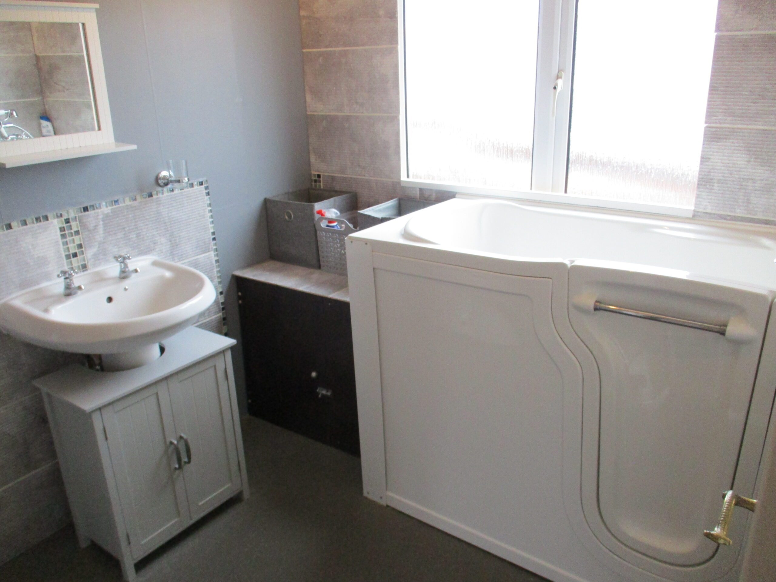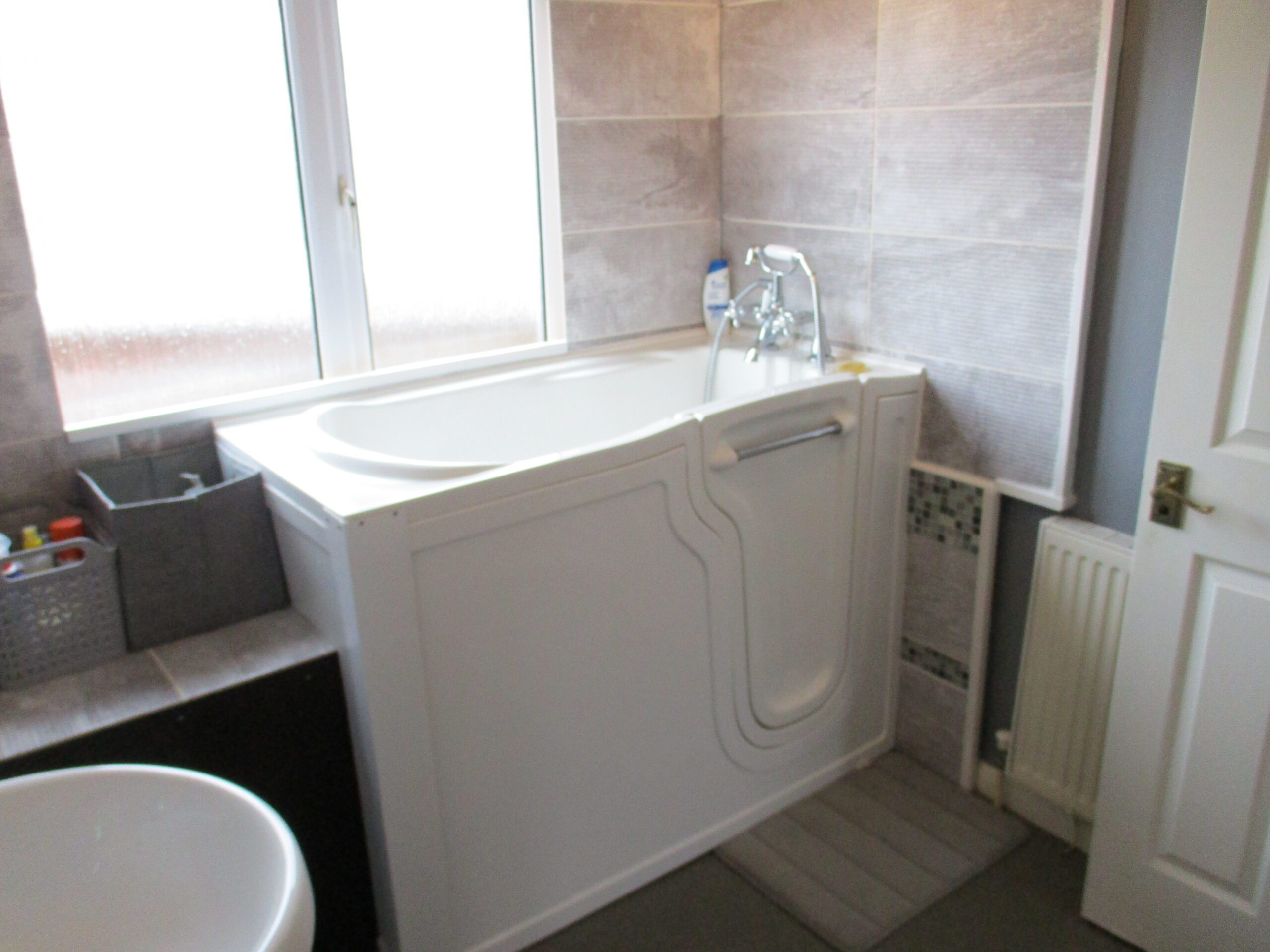 White wash-hand basin with storage unit underneath. Walk-in easy access bath with chrome shower mixer taps. W.C. Tiled splashbacks. Extractor fan. Obscured double glazed window to the side elevation. Roller blind. Low level storage compartment. Non slip vinyl flooring. Radiator.