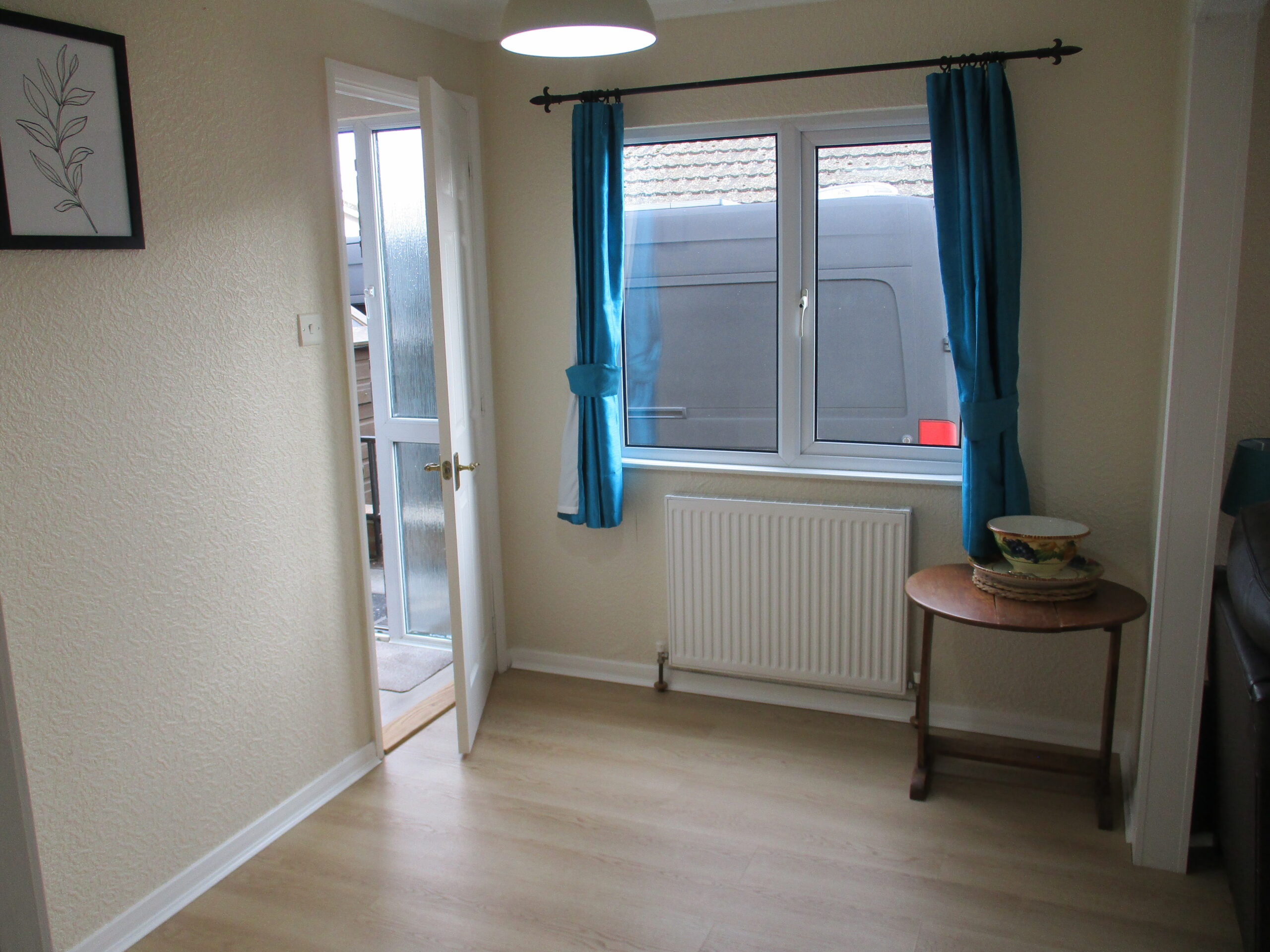 Double glazed window to the side elevation. Curtains. Lightshade. Laminate flooring. Radiator. Open plan recess through to the lounge. Doors off to entrance hall, lounge and fitted kitchen.