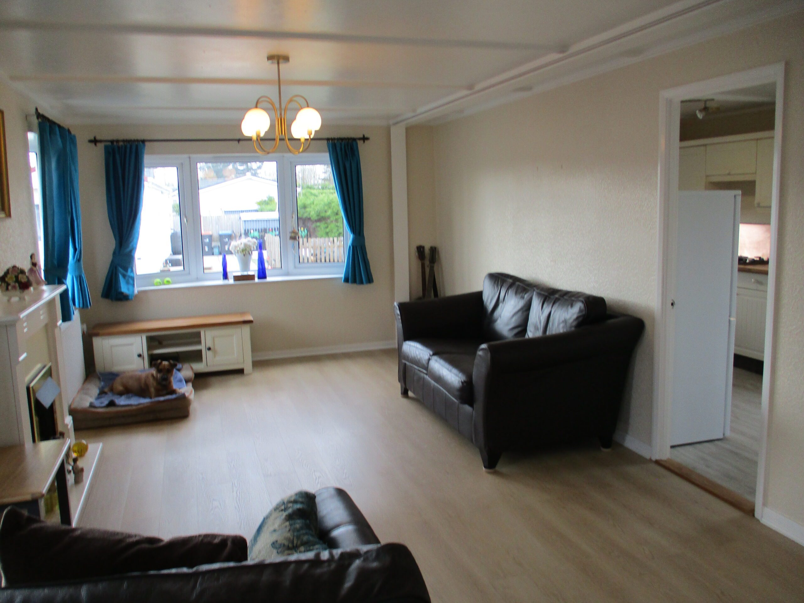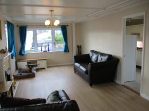 Double glazed window to the front elevation and two to the side elevations. Curtains. 4-Light ceiling pendant. Smoke alarm. Electric coal effect fire set with an ornamental surround. Television point. Television unit is to be included in the sale. Laminate flooring. Two radiators. Open recess through to the dining area. Door through to fitted kitchen.
