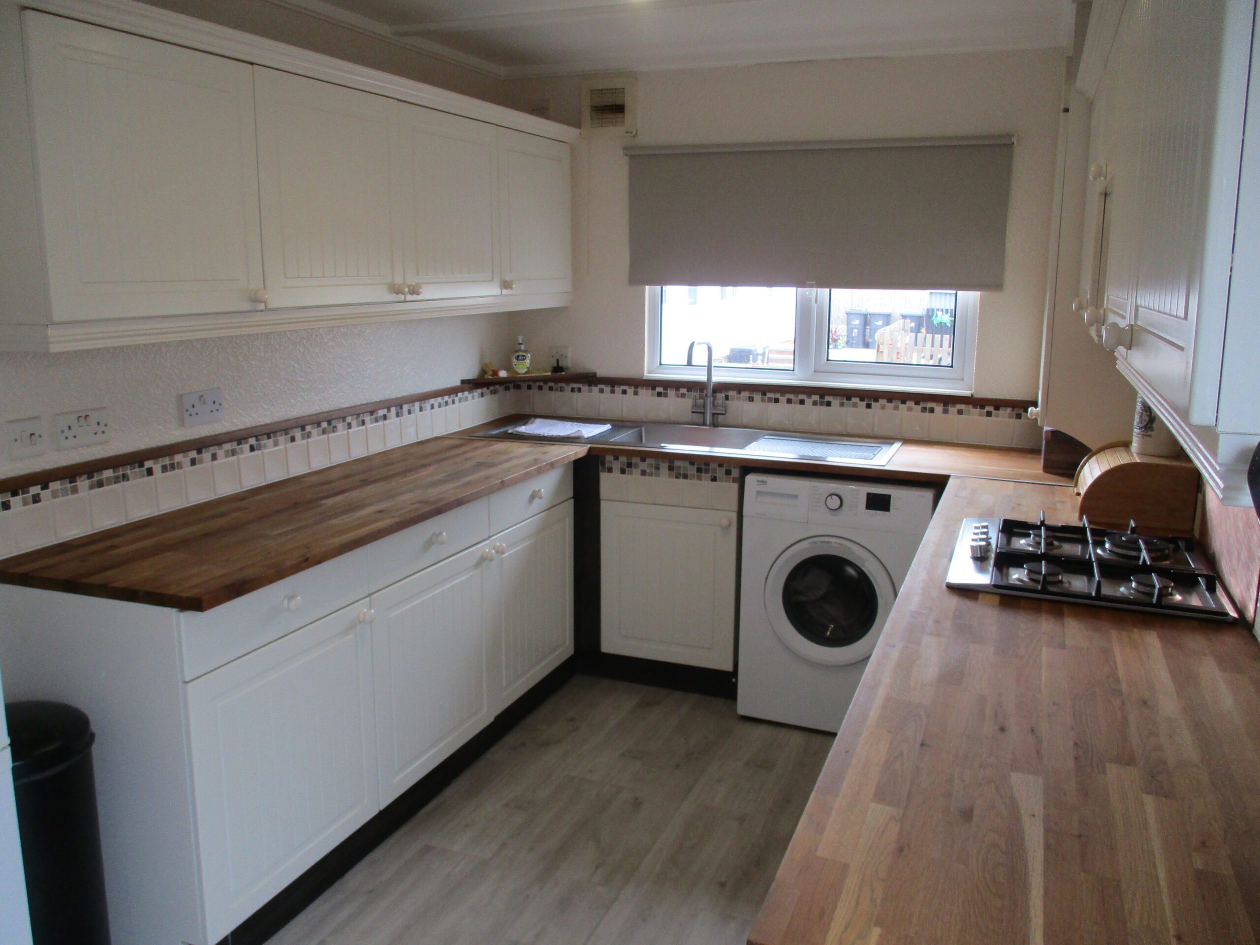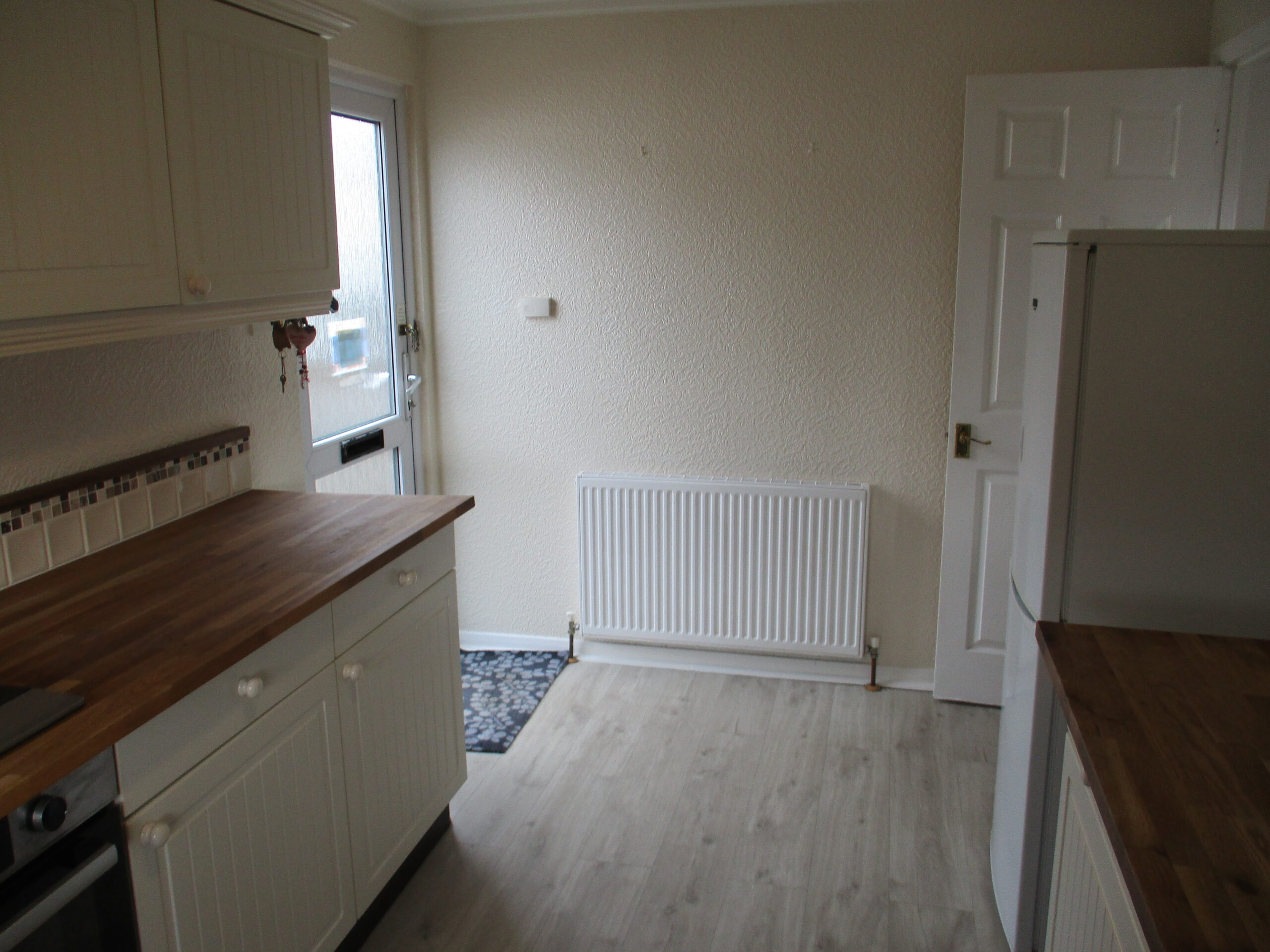 Plentiful modern wall and base unts incorporating a double drainer sink unit with chrome swan neck mixer taps. One of the units conceals the Worcester central heating boiler. Oak wood worksurface areas. Tiled splashbacks. Central heating programmer. Built-in 4-ring gas hob and fan-assisted oven. Plumbed for washing machine. Space for fridge/freezer. Extractor fan. Double glazed window to the front elevation. Roller blind. Laminate flooring. Radiator. Part glazed obscured U.P.V.C rear door.