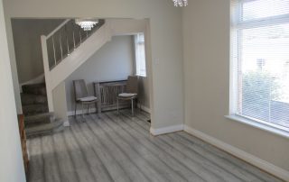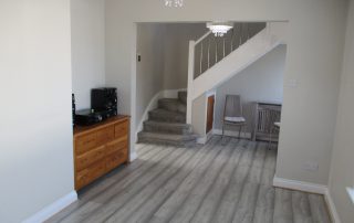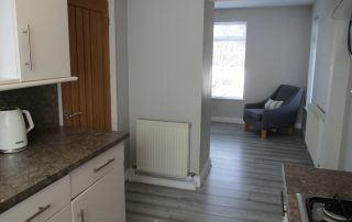 This is a spacious dual-aspect room, entered through a part-glazed UPVC door. Double-glazed windows to rear & side elevations with venetian blinds. Radiator with lattice cover. Laminate flooring. Smoke alarm. Carbon monoxide alarm. There is an under-the-stair storage cupboard. Central heating programmer. Two light fittings. Amply power supply. Another radiator with thermostatic valve. Open recess to fitted kitchen and oak door off to living room.