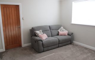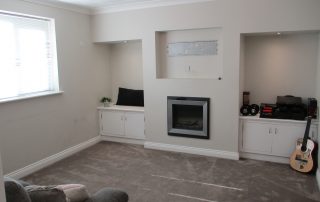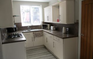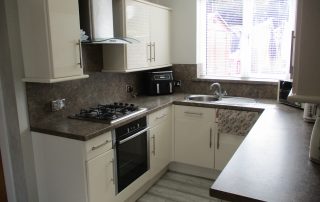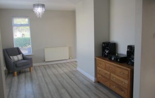 This is a bright living room with a double-glazed window to rear garden with venetian blinds. Fitted carpet. Coving. Radiator with thermostatic valve. There is a log-affect electric fire. TV Bracket. Two shelved storage cupboards. Modern LED light fitting. Two chrome light switches and two chrome inset spotlights. Oak door off to Kitchen.