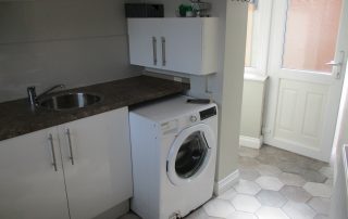 Handy utility room with marble affect base units and single drainer sink & tap. Double glazed window to front, side and rear elevations. Radiator with thermostatic valve. Amply power supply. Plumbing for washing machine. Space for tumble dryer and freezer. There is a cream wall storage cupboard housing the Combi Compact HE boiler and HIVE Central heating. Triple light fitting. Hatch to loft. Tiled hexagonal flooring. There is a white gloss storage compartment housing the electric consumer unit and meter. Smoke alarm. Walled coat hooks. Part-glazed UPVC door to rear garden.