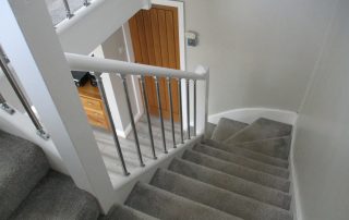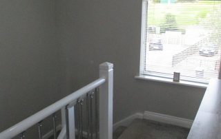 Fitted carpeted stairwell with chrome balustrades. Radiator with thermostatic valve with lattice cover. Ceiling light fitting. Double-glazed window to front elevation with venetian blinds. Smoke alarm. There is also a shelved linen cupboard housing a shower pump, cooker point socket, coat hooks and hatch to attic (2.00m x 0.80m).Oak doors off to 2 good-sized bedrooms and bathroom.