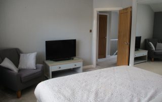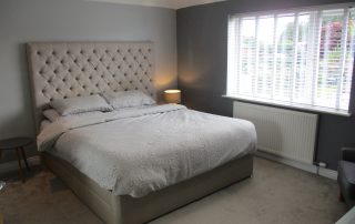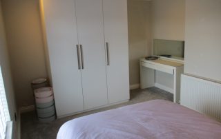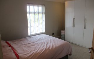 This is a bright and spacious bedroom with double-glazed window to the front elevation with plantation/venetian blinds. Fitted carpet. Radiator with thermostatic valve. 5 Inset spotlights. Amply brush chrome power sockets. Single chrome dimmer switch. TV aerial point. Triple freestanding wardrobe. Vanity unit with rectangular wall display mirror.