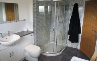 Great sized bathroom with a double-glazed obscured window to rear elevation. Radiator with thermostatic valve. 5 Inset spotlights. Corner double shower with Mira Sport Electric shower with tiled shower surround. Tiled splashbacks round closed couple W.C and sink with mixer taps and storage space underneath. Above the sink there is a wall mounted display rectangular mirror. There is also a spilt level tiled bath with mixer taps. Display rack. Anthracite grey tiled flooring. Walled coat hook.