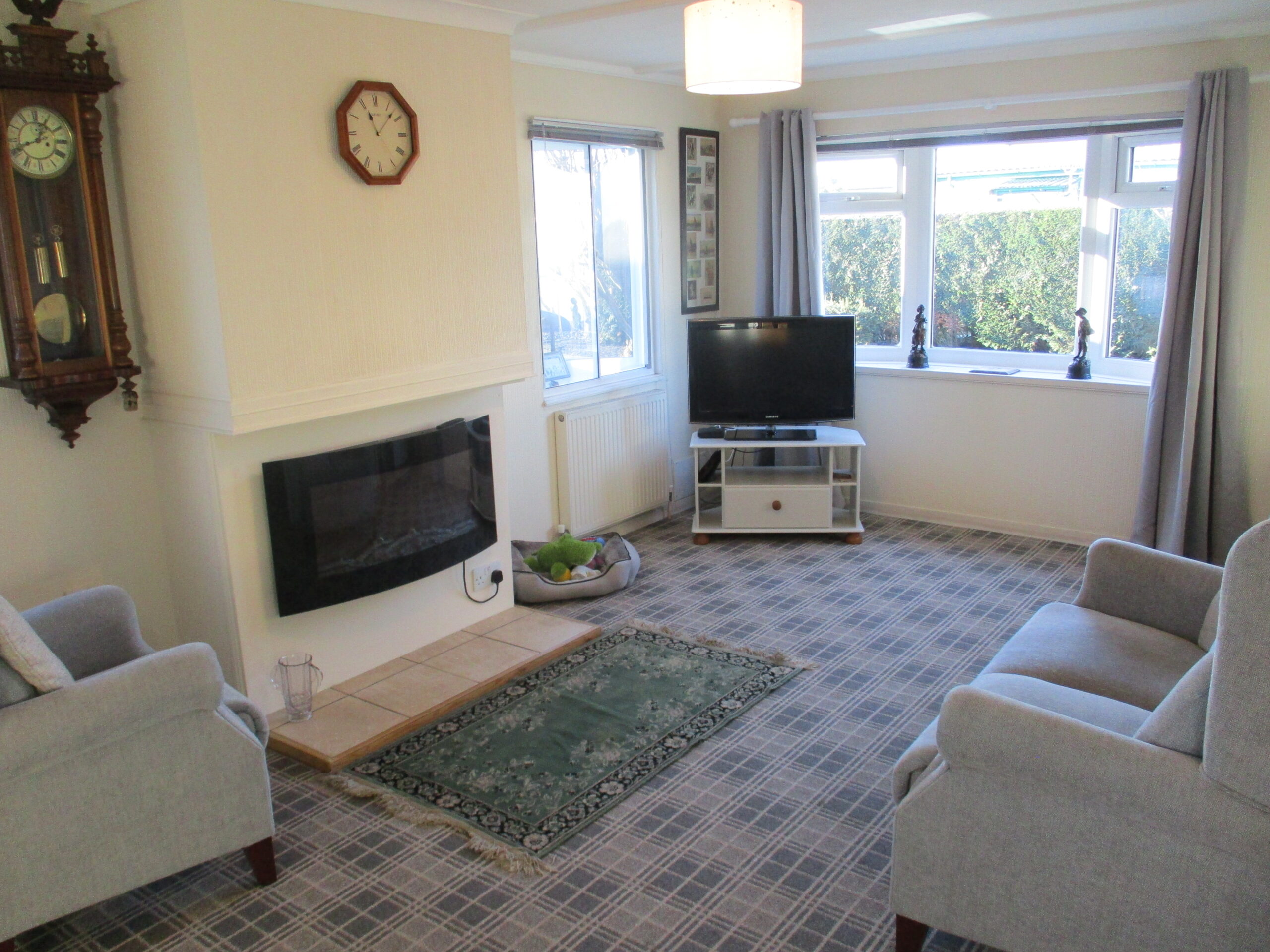 Lovely bright dual aspect room with double glazed bay windows to the front and side elevations. Venetian blinds. Television point. Telephone point. Coving. Lightshade. Two single wall lights. Wall mounted electric remote controlled log effect fire. Fitted carpet. Two radiators. Open recess through to dining area. Part glazed timber framed door through to fitted kitchen and inner hallway.
