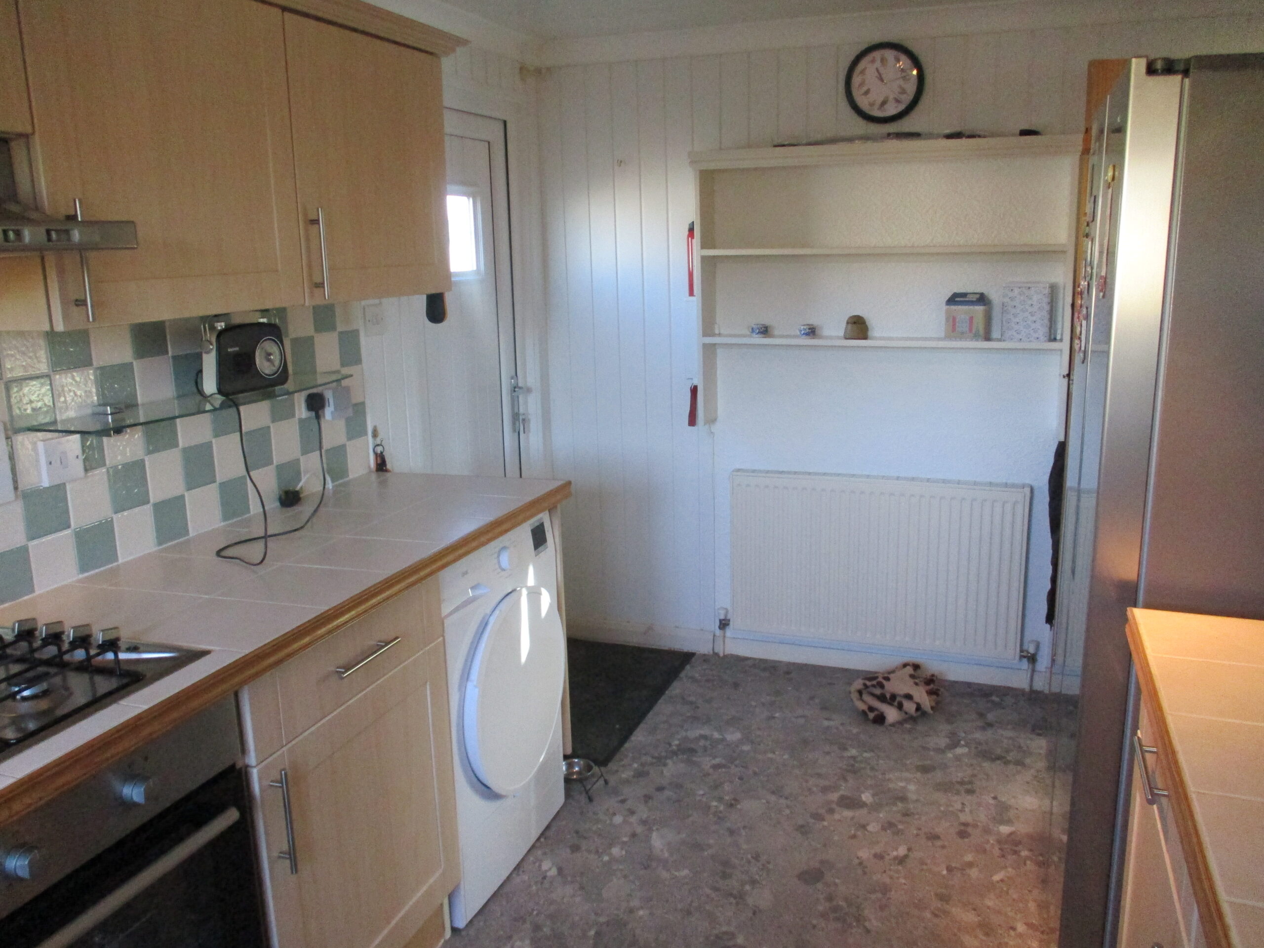 Modern wall and base units incorporating a white ceramic single drainer sink unit with vegetable compartment and chrome swan neck mixer taps. Worcester combi-boiler concealed in one of the wall units. Tiled worksurface areas and splashbacks. Built-in 4-ring gas hob, fan-assisted oven and chrome cooker hood extractor. Plumbed for washing machine and slimline dishwasher. Space for tumble dryer and fridge/freezer. Coving. Display shelving. Double glazed window to the side elevation. Venetian blinds. Vinyl flooring. Radiator. Obscured glazed dual coloured composite rear door. Part glazed timber framed door through to lounge.