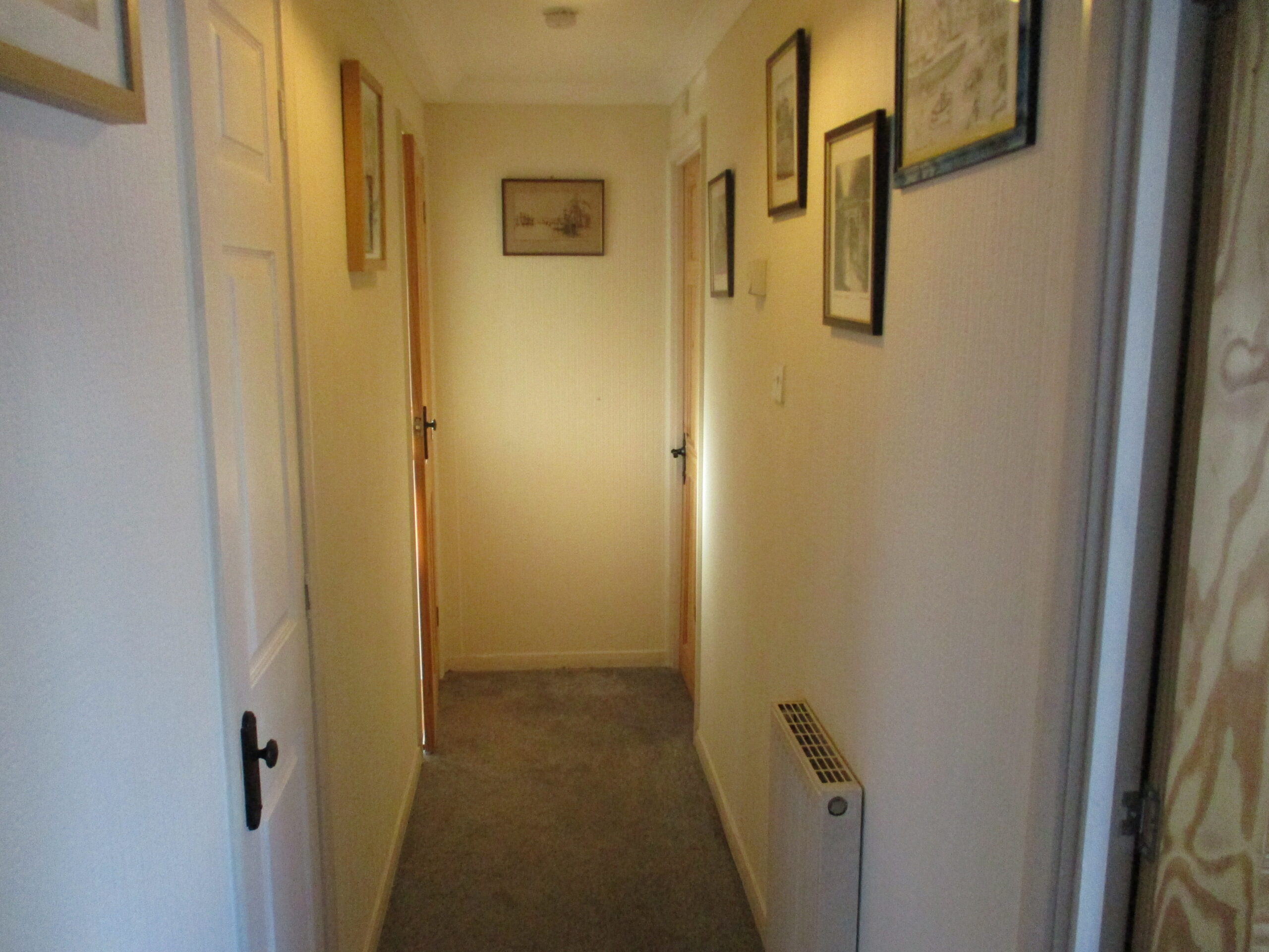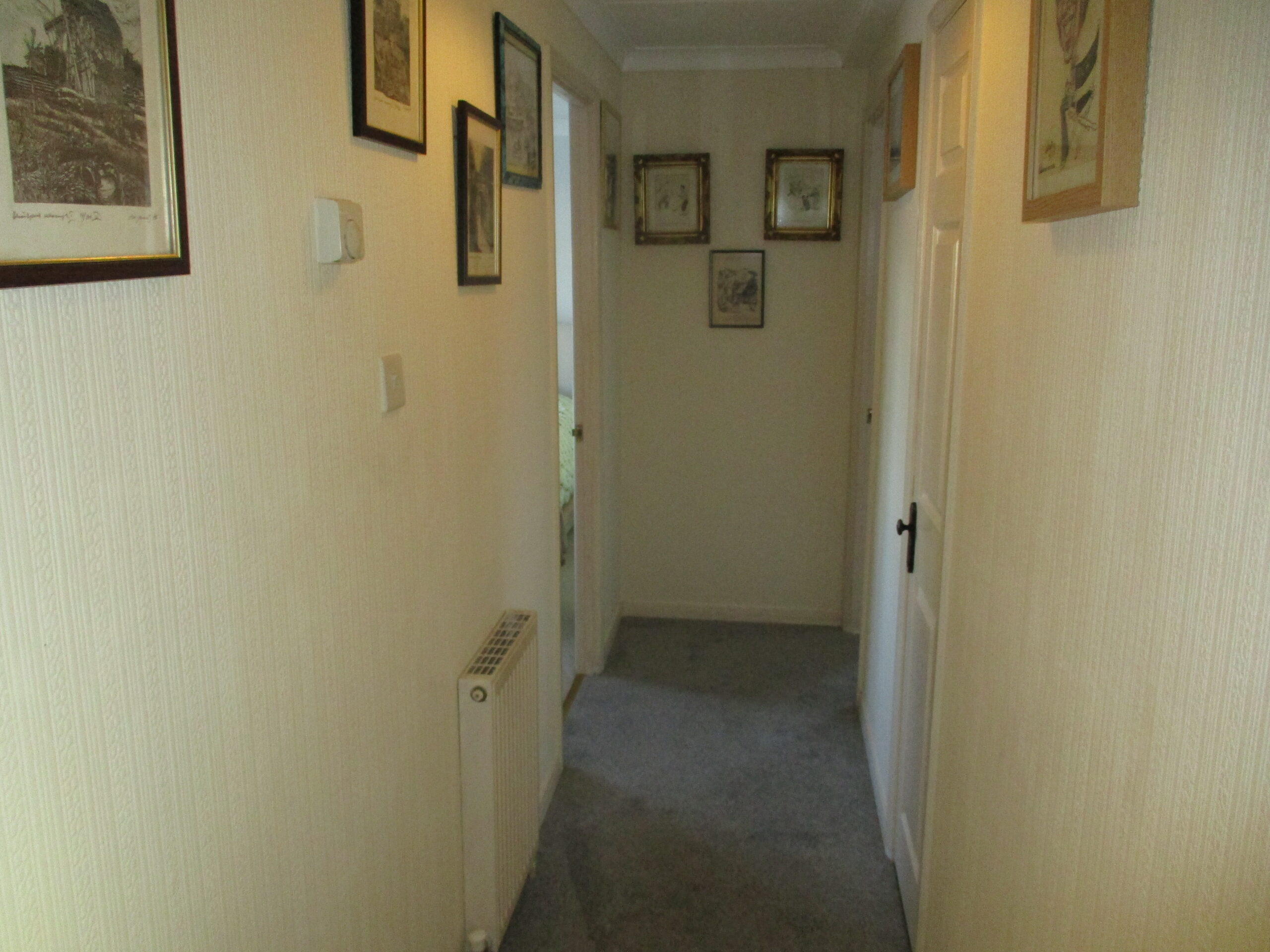 Honeywell thermostat. Coving. Shelved linen cupboard with power point. Smoke alarm. Lightshade. Fitted carpet. Radiator. Timber framed doors off to two bedrooms and bathroom.