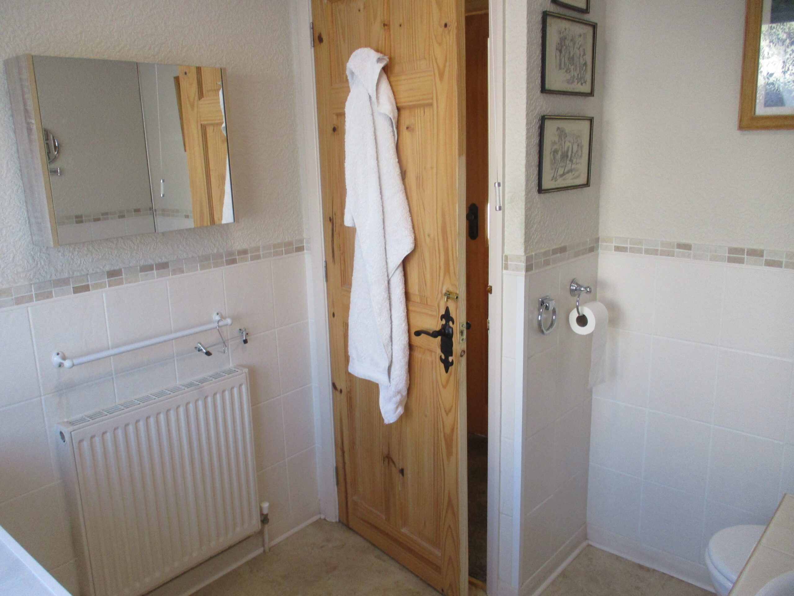 White wash-hand basin and dual flush W.C. Built-in low level shelved storage units. Obscured double glazed window to the rear elevation. Roller blind. Partially tiled walls. LED ceiling light. Coving. Extractor fan. Vinyl flooring. Radiator.