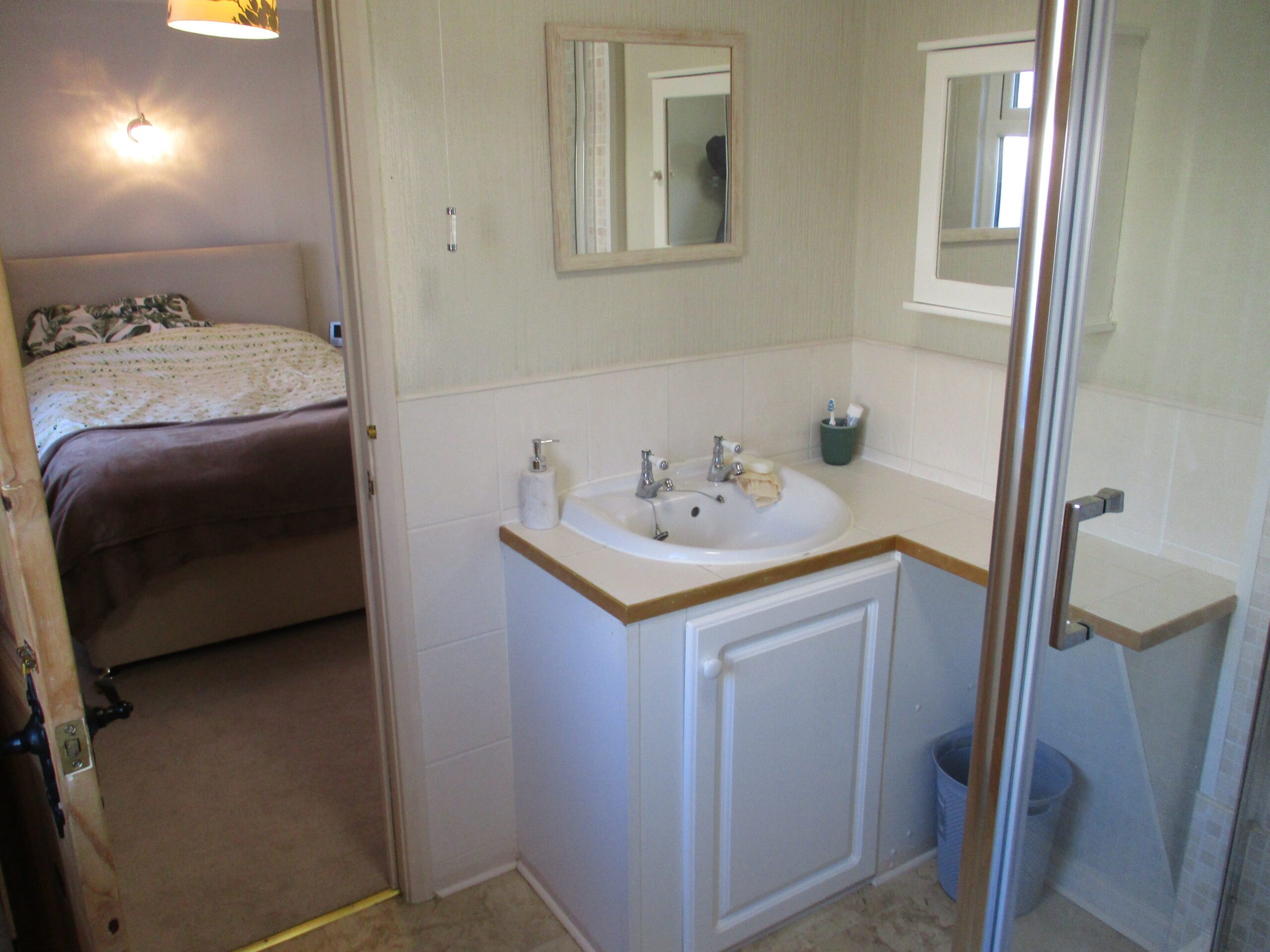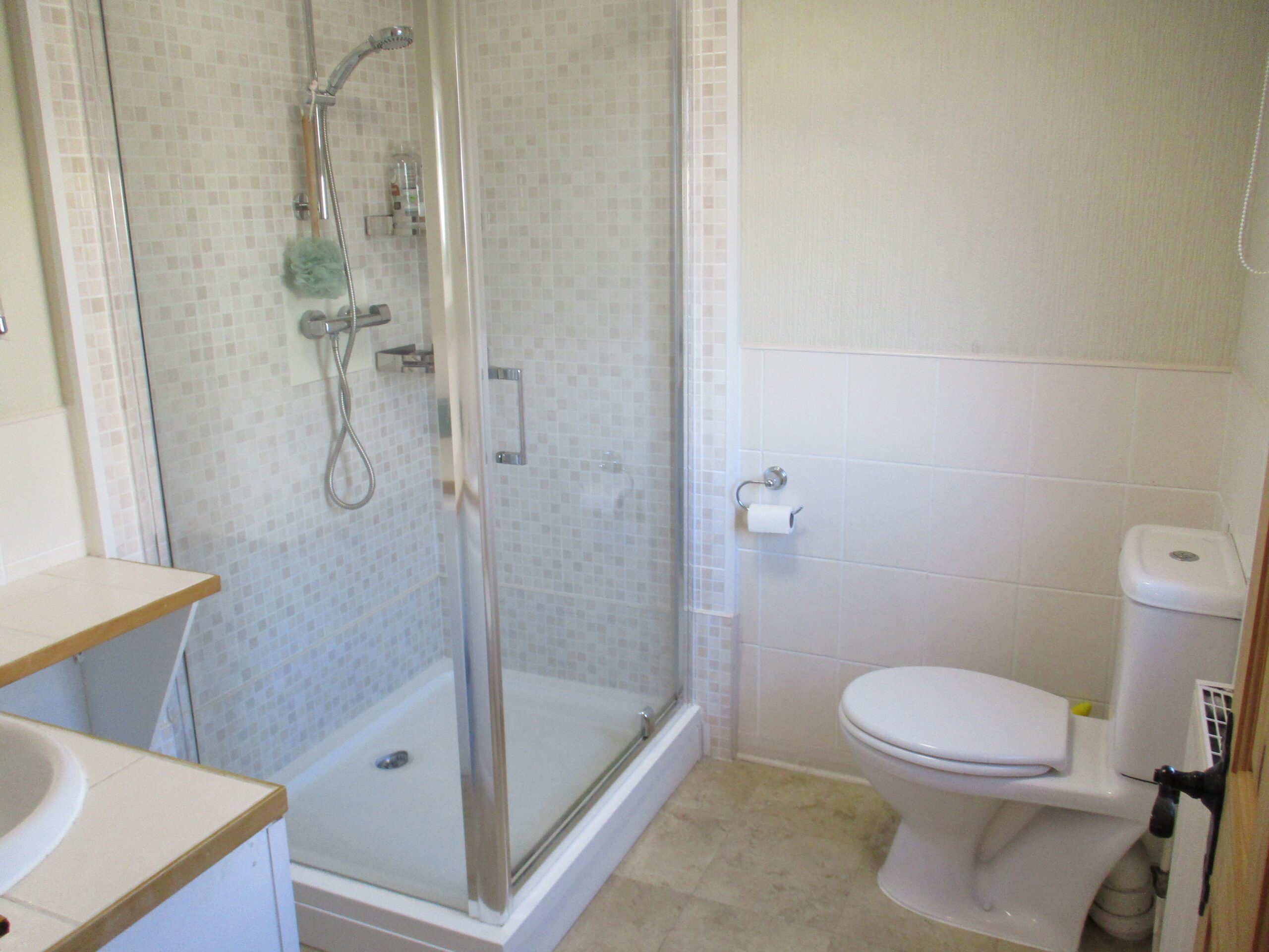 White wash-hand basin with storage unit underneath. Dual flush W.C. Tiled shower cubicle with mains powered shower. Obscured double glazed window to the rear elevation. Roller blind. Partially tiled walls. LED ceiling light. Coving. Extractor fan. Vinyl flooring. Radiator.