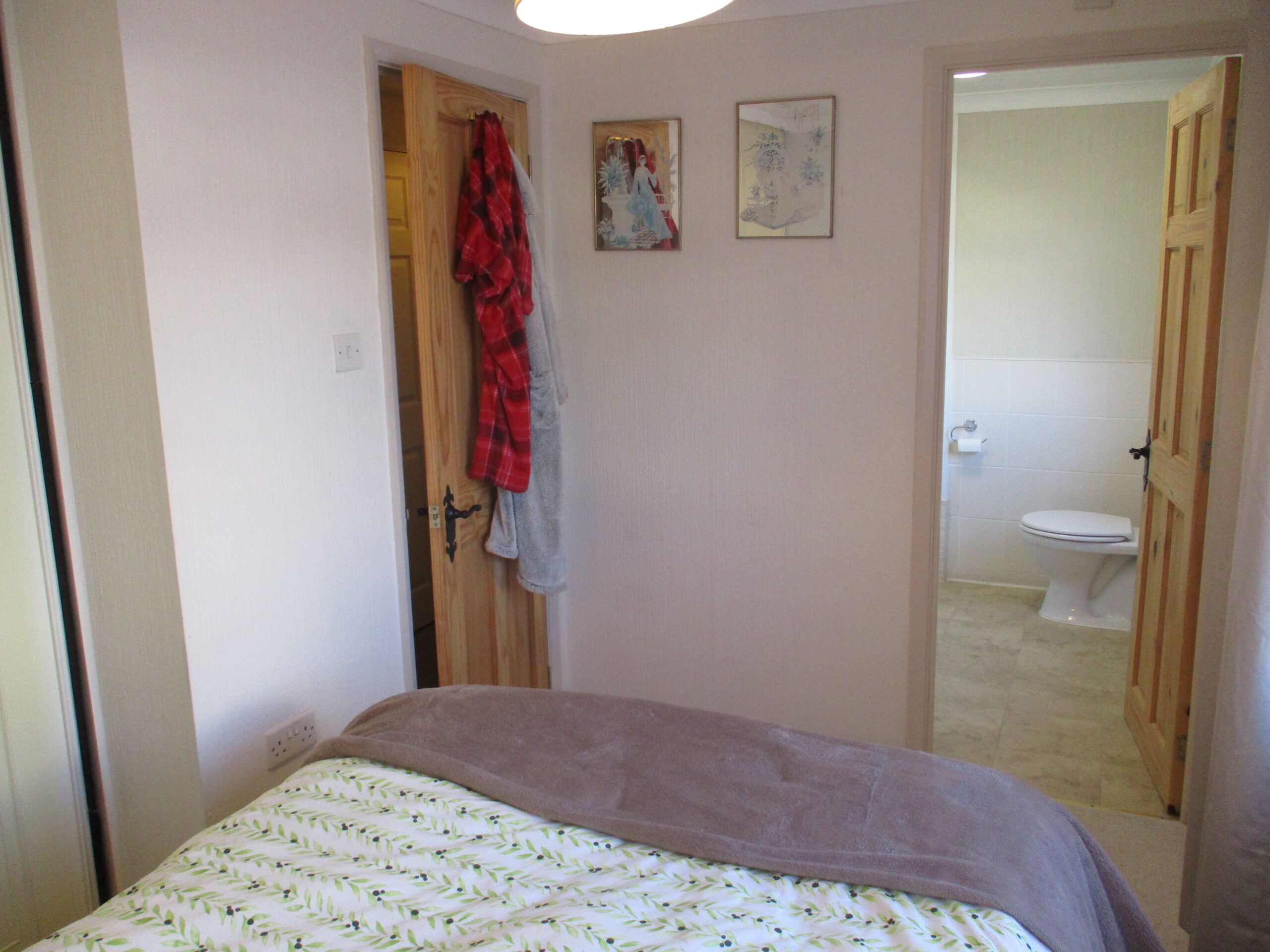 Bright room with double glazed window to the rear elevation. Roller blind. Built-in wardrobes with rail, shelving and wall mounted low level tubular electric heater. PVC panelling on two walls. Coving. Lightshade. Single wall light. Dimmer switch. Fitted carpet. Radiator. Door through to en-suite.