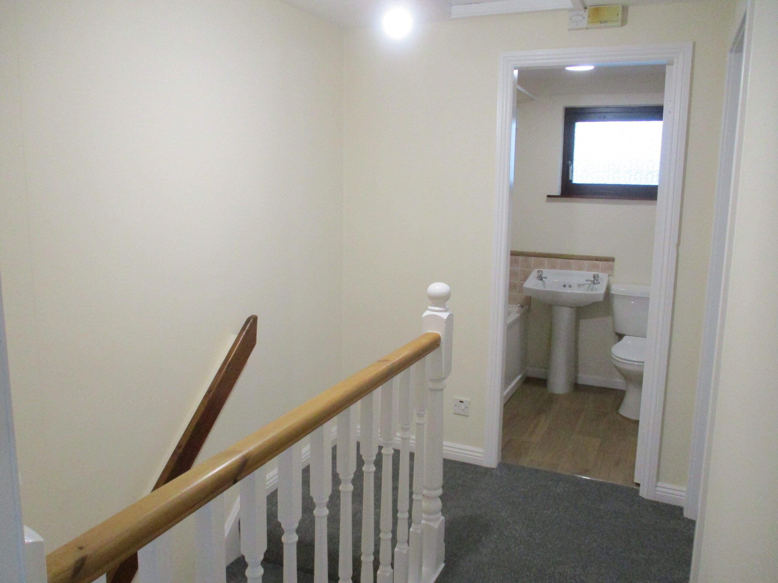 Handrail to one side. Hatch to insulated attic. Smoke alarm. Fitted carpet. Doors off to two double bedrooms and bathroom.