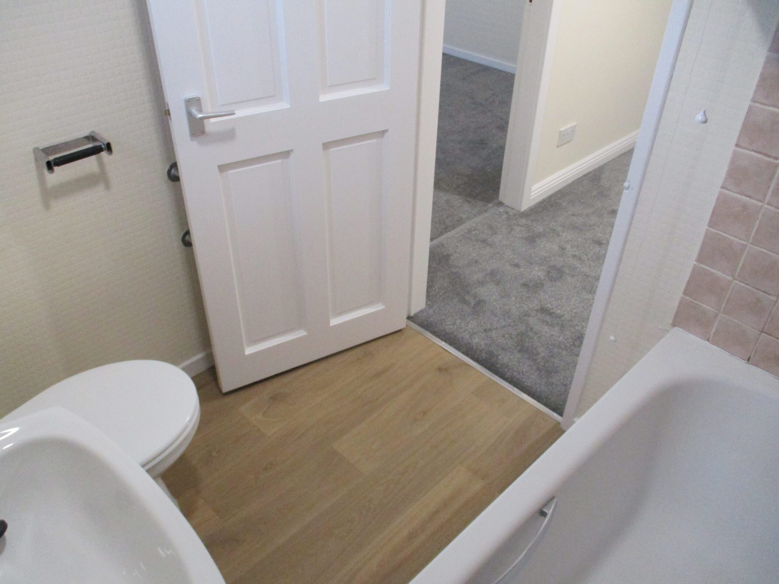 White three piece suite comprising bath, wash-hand basin and W.C. Mira Sport shower over the bath with shower rail and shower curtain attached. PVC ceiling with LED ceiling light. Vinyl flooring. Electric chrome heated towel rail.