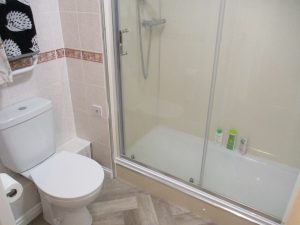 Double shower cubicle with mains powered shower, wash-hand basin and dual flush W.C. Fully tiled walls. Flush LED ceiling light. Shaver point. Extractor fan. Vinyl flooring. Small Consort heated towel rail. Small Dimplex wall heater.