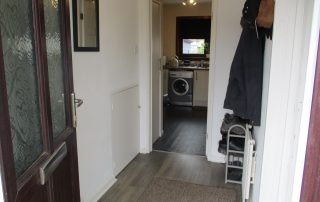 Entered through a part-glazed UPVC door. Useful under the stair storage cupboard (1.45m x 1.10m) comprising of laminated flooring and electricity consumer unit & meter. In hallway there is a smoke alarm. Ceiling light. Coat hooks. Telephone point. Laminated flooring. Radiator. Honeywell thermostat. Small double-glazed window to front elevation with vertical blinds. Doors off to living room & fitted kitchen.