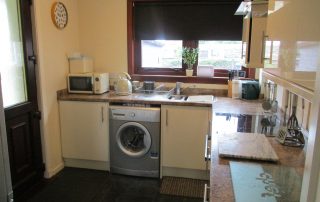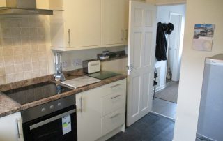 A contemporary kitchen with a high gloss cream coloured wall & base unit. There are complimentary work surfaces and upstands. Plumbing for washing machine. Built-in fan oven with electric hob and chrome chimney hood extractor above. There are tiled splashbacks above the hob. Single drainer sink unit with a vegetable compartment and chrome mixer taps. Triple light fitting. Double-glazed window to rear elevation with roller blind. Vinyl flooring. Radiator with thermostatic valve. Space for fridge/freezer. Part glazed UPVC door. There is also a shelved storage cupboard (1.00m x 0.71m)
