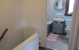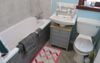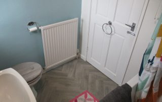 White three-piece suite comprising of wash hand basin, bath with shower mixer taps & double W.C. Tiled walls above bath and wash hand basin. Shower rail and curtain above bath. There is an obscure double-glazed window to rear elevation. LED ceiling light. Vinyl flooring. Radiator with thermostatic valve.