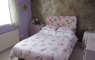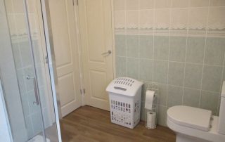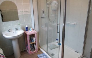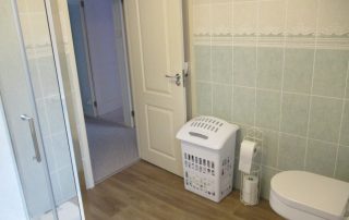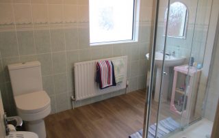 Obscured double glazed window to the rear elevation. White wash-hand basin and newly fitted, raised for ease of use dual flush W.C. Fully tiled walls. LED ceiling light. Large oblong shower cubicle with Triton T802 Electric shower. Built-in shelved storage cupboard (0.65m x 0.65m). Vinyl flooring. Radiator with thermostatic valve.