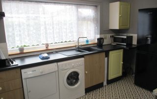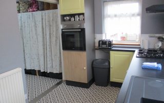 Recently refurbished kitchen with a range of wall and base units incorporating a black coloured single drainer composite sink with vegetable compartment and chrome swan neck mixer taps. Plumbed for washing machine and space for tumble dryer and fridge/freezer. Built-in 4-ring gas hob connected to external bottled gas, fan-assisted oven and cooker extractor. Double glazed window to the rear and side elevation. Tiled splashbacks. Smoke alarm. Ceiling striplight. Modern laminate flooring. Part glazed door to front vestibule.