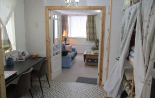 A lovely and bright dual aspect room with double glazed windows to the front and side elevations. Ornamental composite marble stone effect fire surround. Triple light fitting. Coving. Television point. Fitted carpet. Radiator with thermostatic valve. Glazed French doors through to laundry room/small office.
