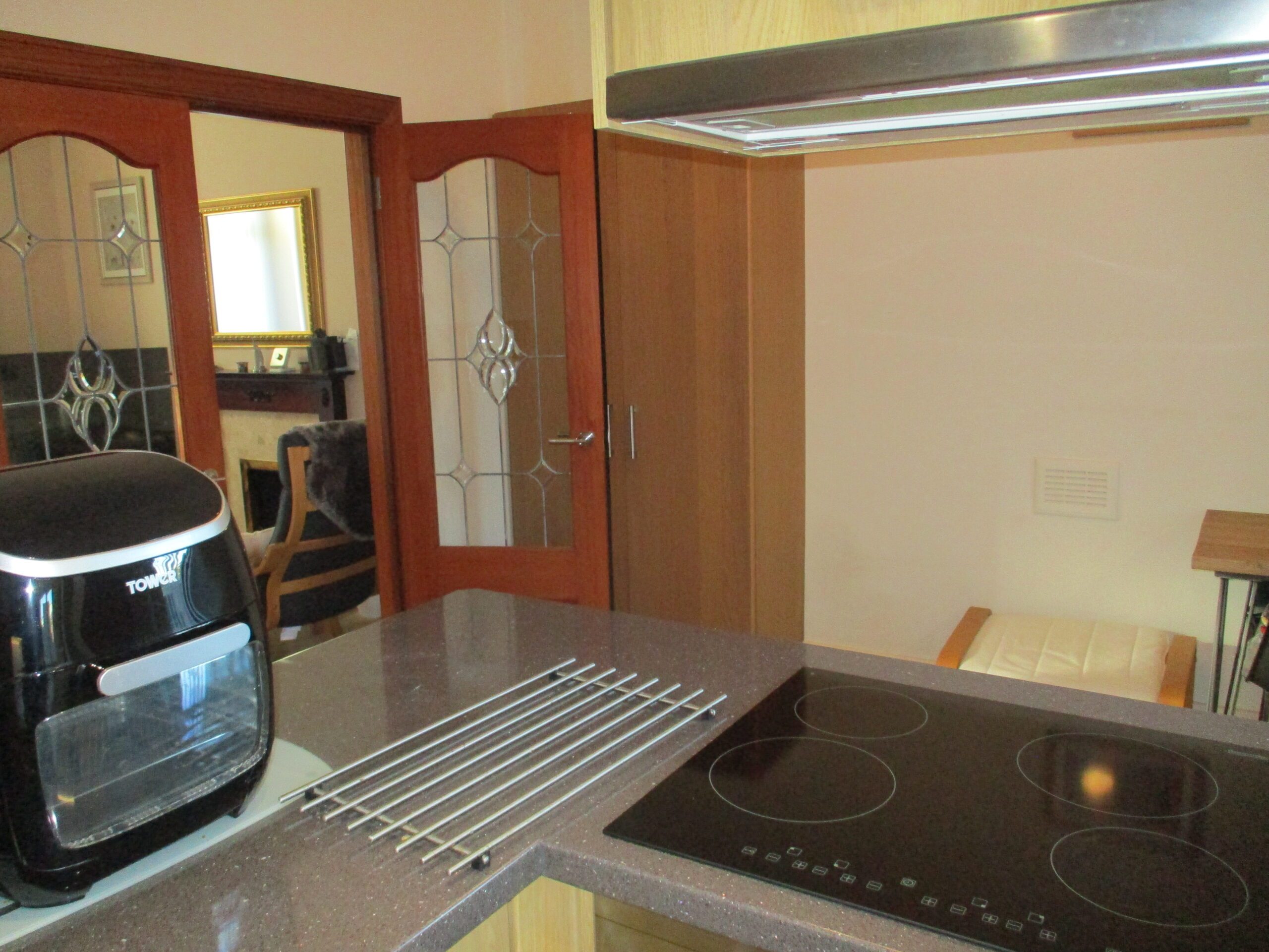 Well proportioned kitchen fitted approximately five years ago benefitting from a contemporary range of wall and base units incorporating a single drainer sink unit with chrome swan neck mixer taps.  Built-in fan-assisted oven, hob and telescopic slide out cooker hood extractor. Plumbed for washing machine and dishwasher.  Integrated fridge. Complimentary worksurface areas and soft close units.  Two double glazed windows to the rear elevation.  Vertical blinds and curtains.  Triple light fitting.  One ceiling spotlight.  Built-in cupboard housing the central heating combi-boiler.  Useful understairs storage cupboard. Laminate flooring.   Radiator with thermostatic valve. Part glazed hardwood French doors through to the lounge.  Part glazed U.P.V.C rear door.