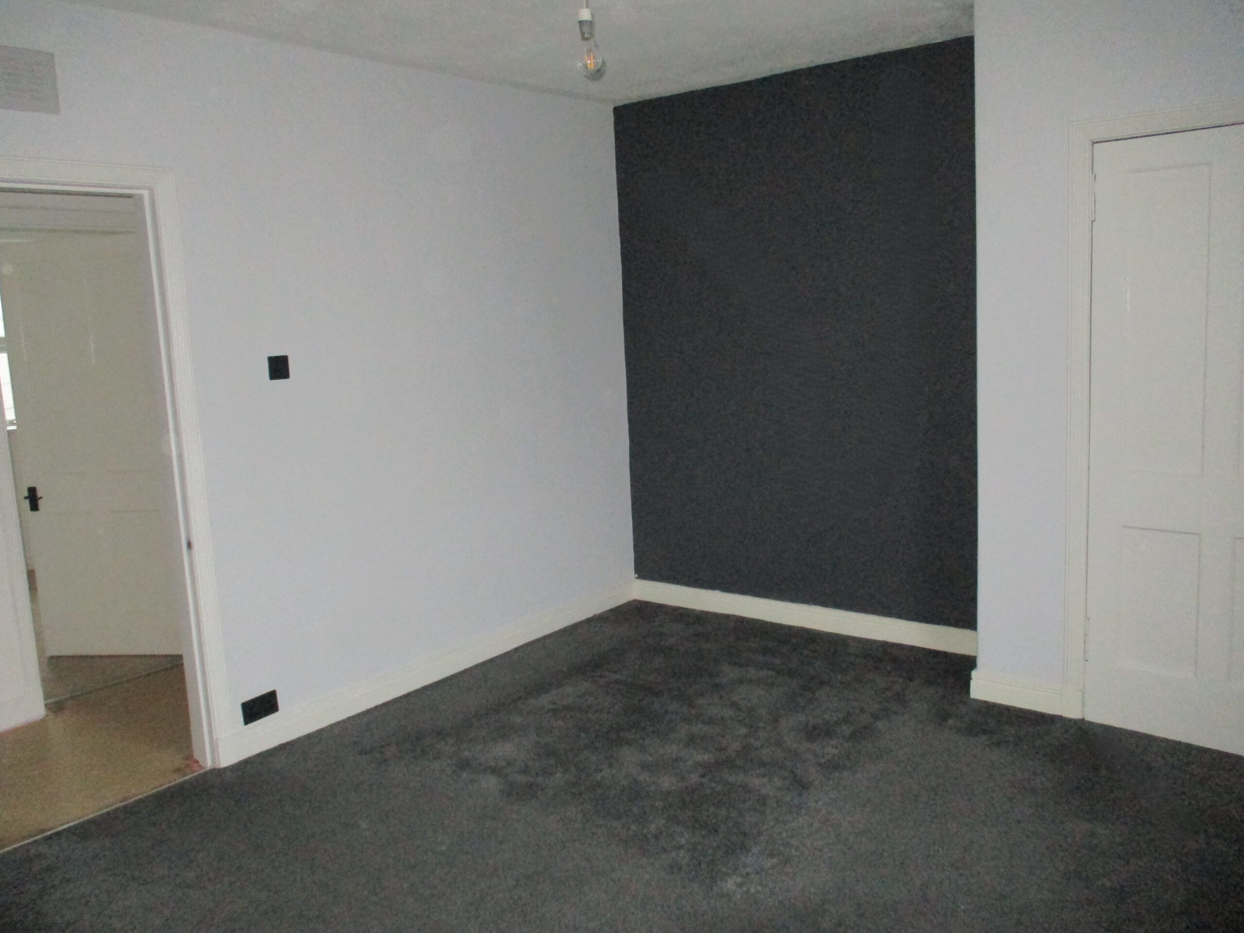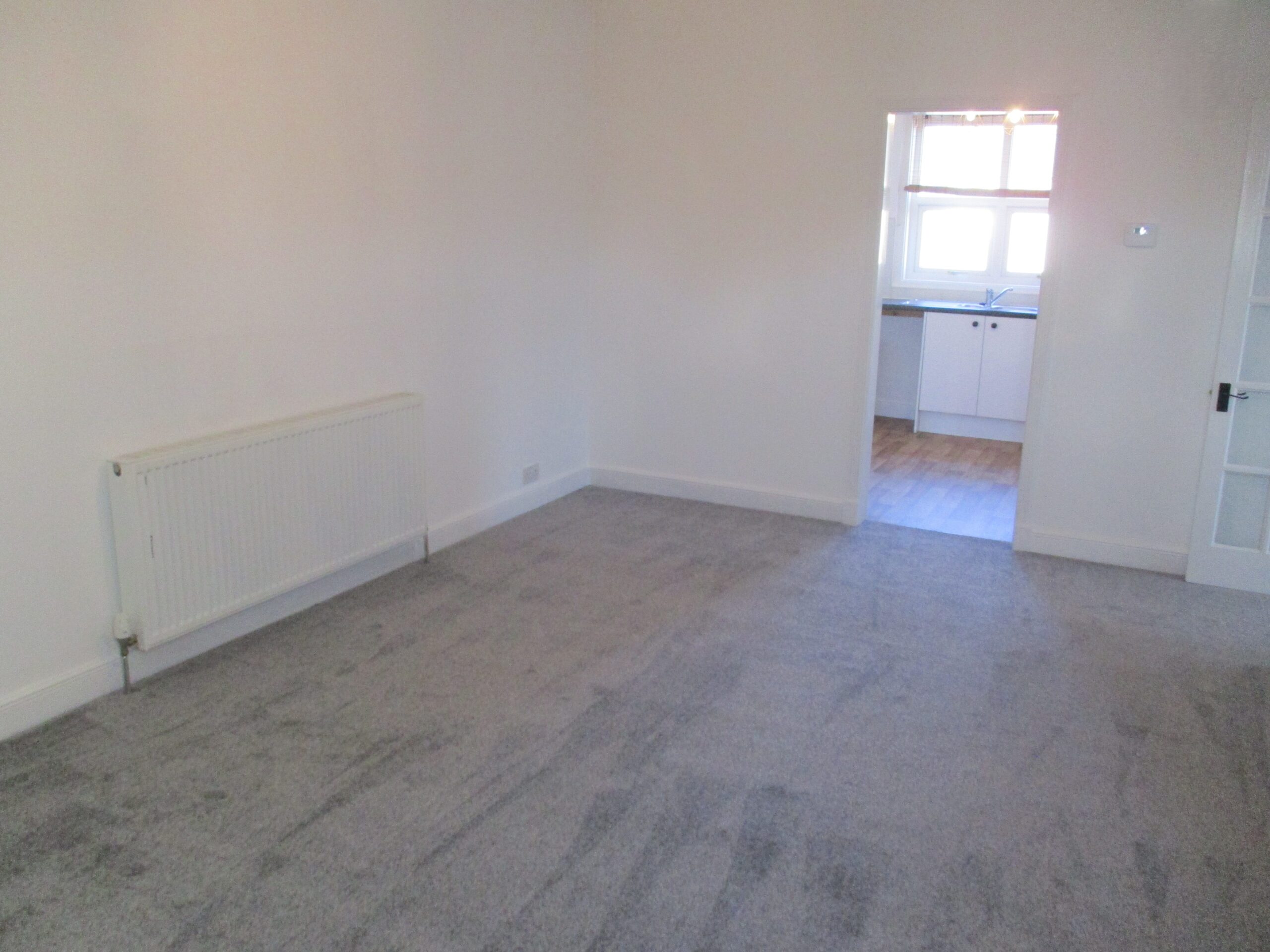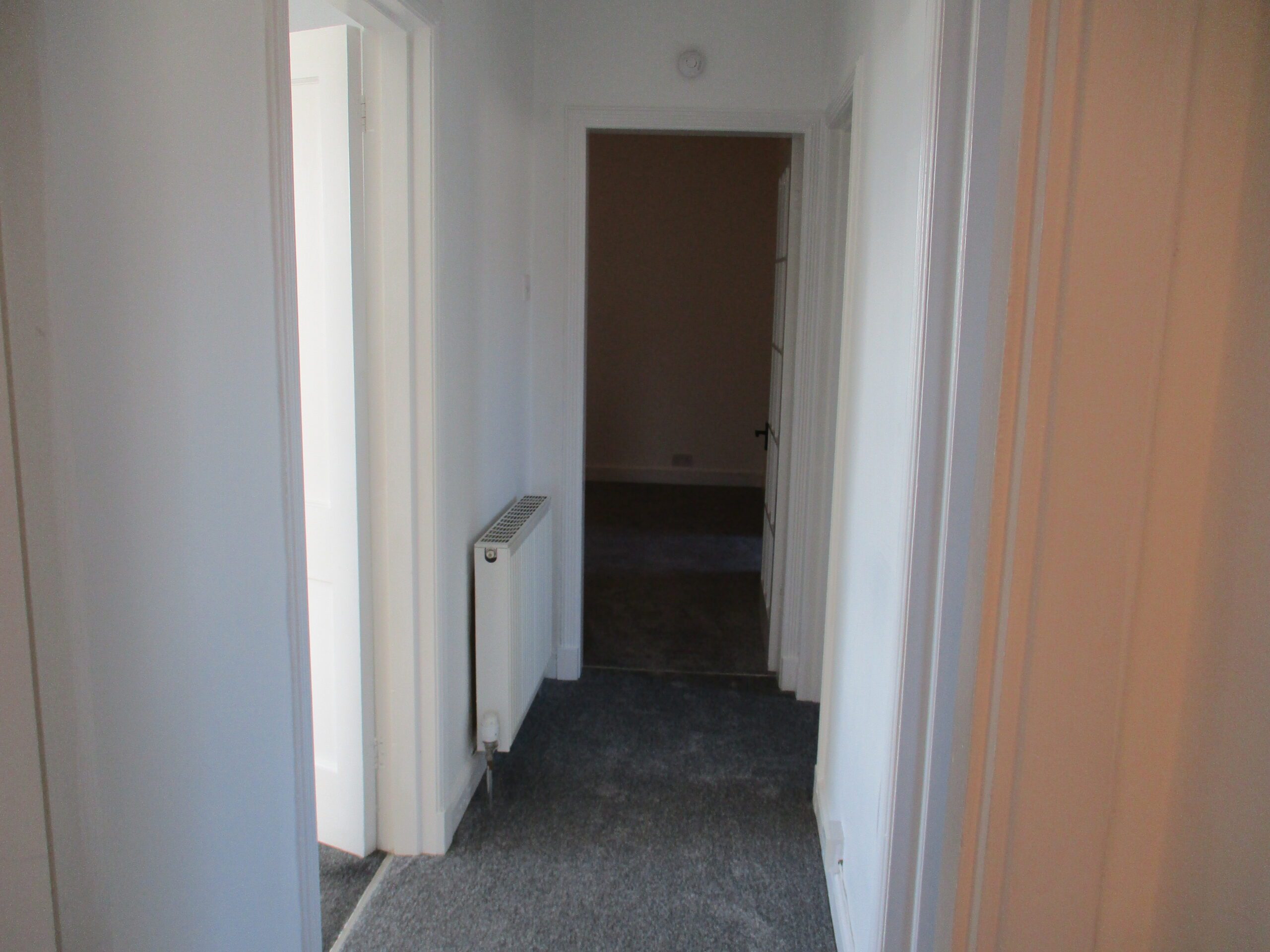 Glazed door through to the lounge and further doors of to two bedrooms and bathroom.  Lightshade.  Smoke alarm. Newly fitted carpet.  Radiator with thermostatic valve.