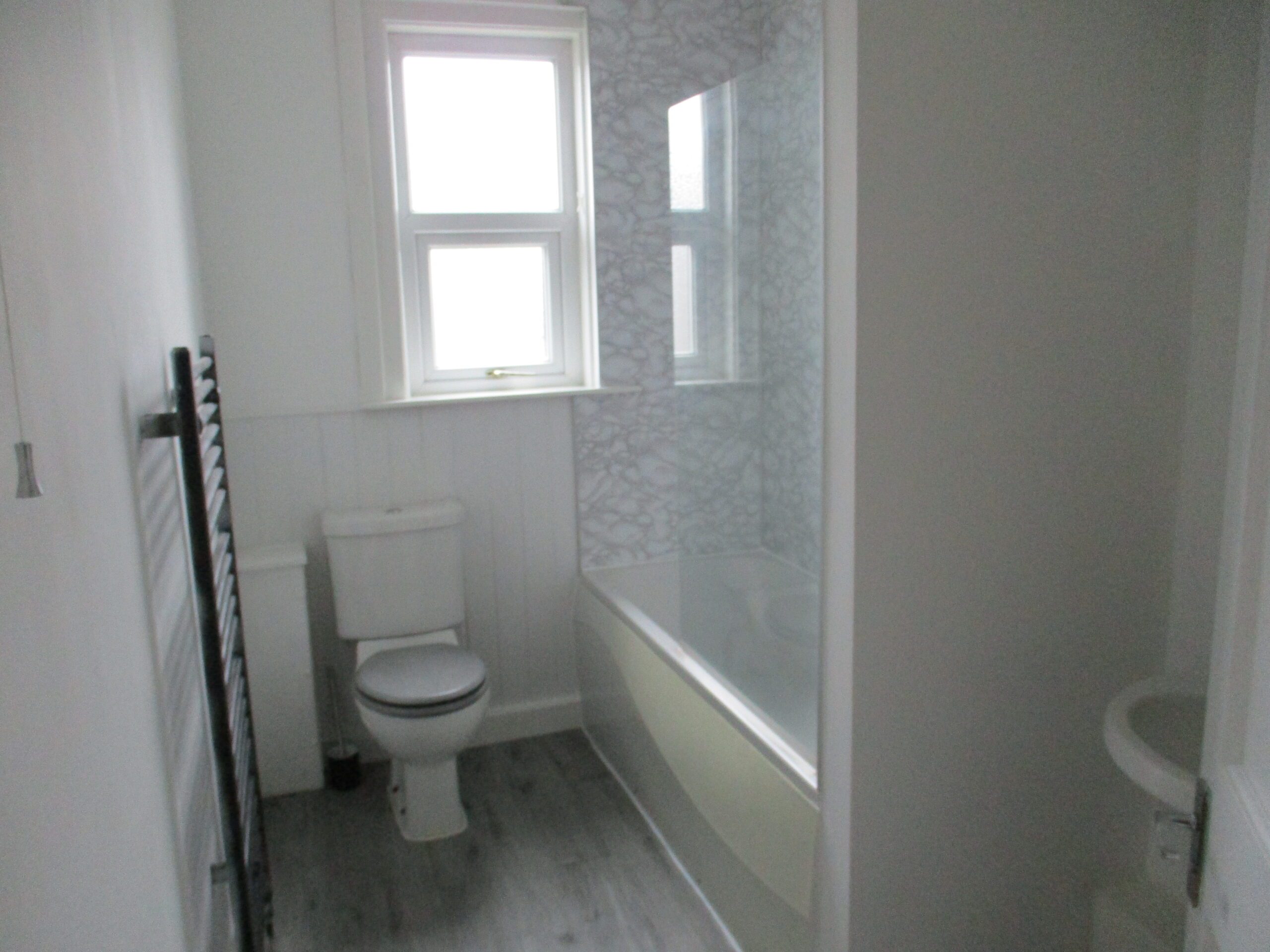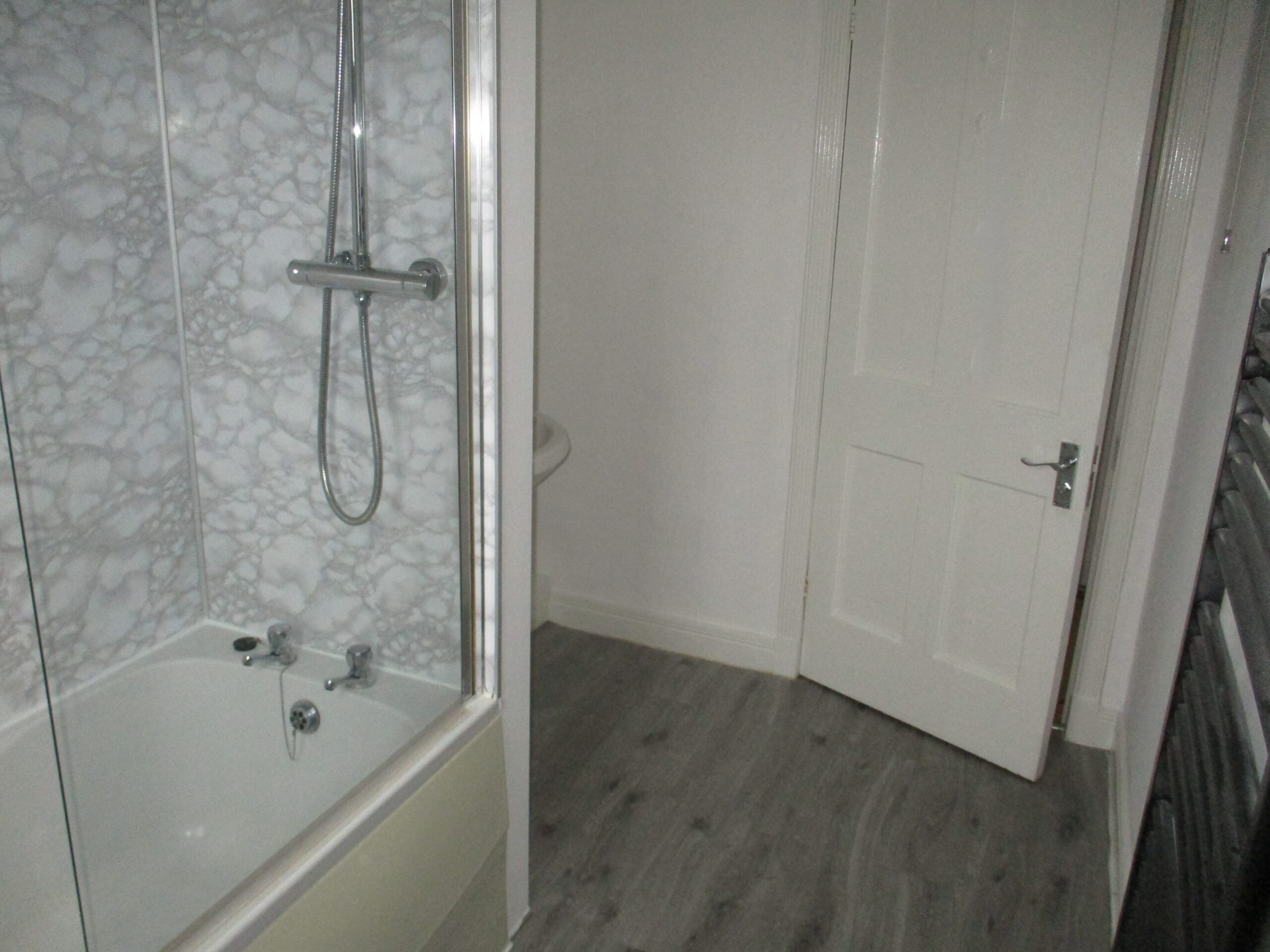 Comprising of white wash-hand basin, bath with double spray rainfall shower and W.C..  Waterproof wall boarding around the shower area.  LED ceiling light.  Extractor fan.  Obscured double glazed window to the rear elevation.  Laminate flooring.  Matt black heated towel rail.