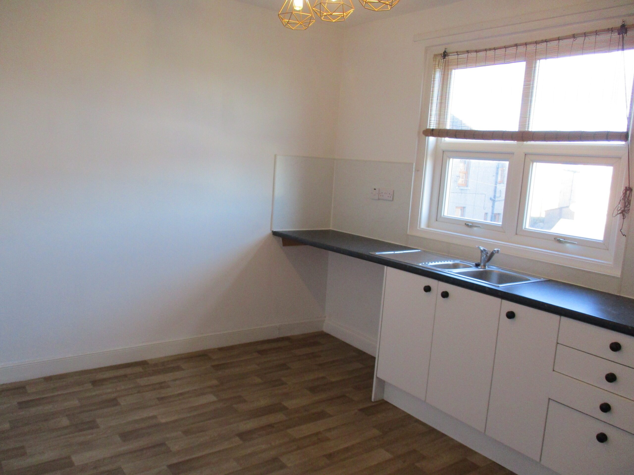 Modern wall and base units incorporating a single drainer sink unit with vegetable compartment and chrome single lever mixer tap. Built-in electric hob, oven and chrome chimney hood extractor. Complimentary worksurface areas and upstands.  Plumbed for washing machine,  Space for tumble dryer and fridge/freezer.  Three light ceiling cage fixture.   Double glazed window to the rear elevation.  Daylight roller blind. Newly fitted vinyl flooring.  Radiator with thermostatic valve.
