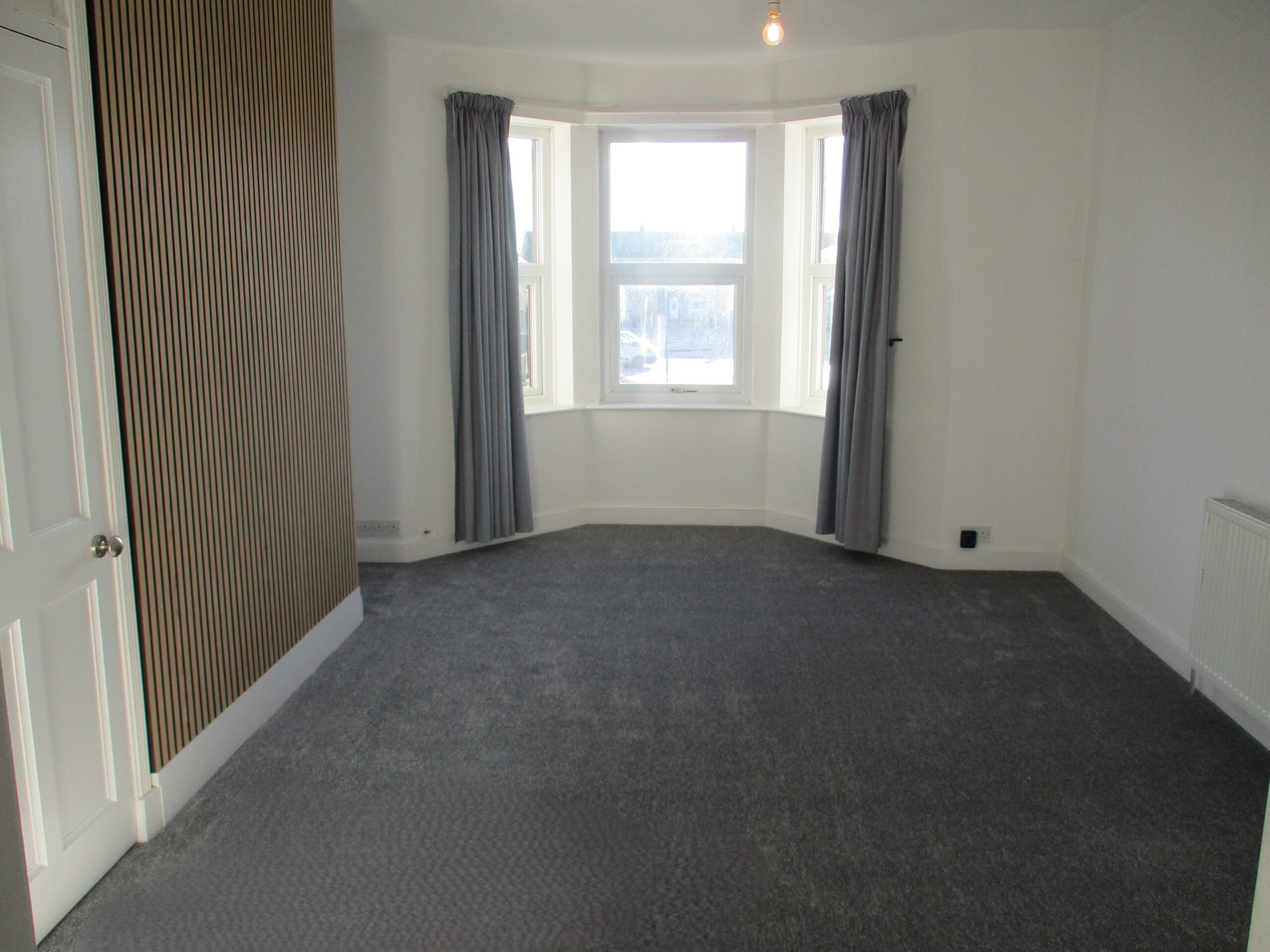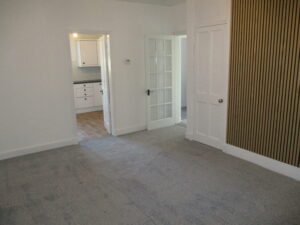 Great sized room with double glazed bay window to the front elevation.  One wall has acoustic slatted panels. Curtains.  Storage cupboard (1.00m x 0.80m) housing the gas-fired Ideal logic combi boiler.  Salus central heating programmer.  Television point.  Newly fitted carpet.  Radiator with thermostatic valve.  Door through to fitted kitchen.