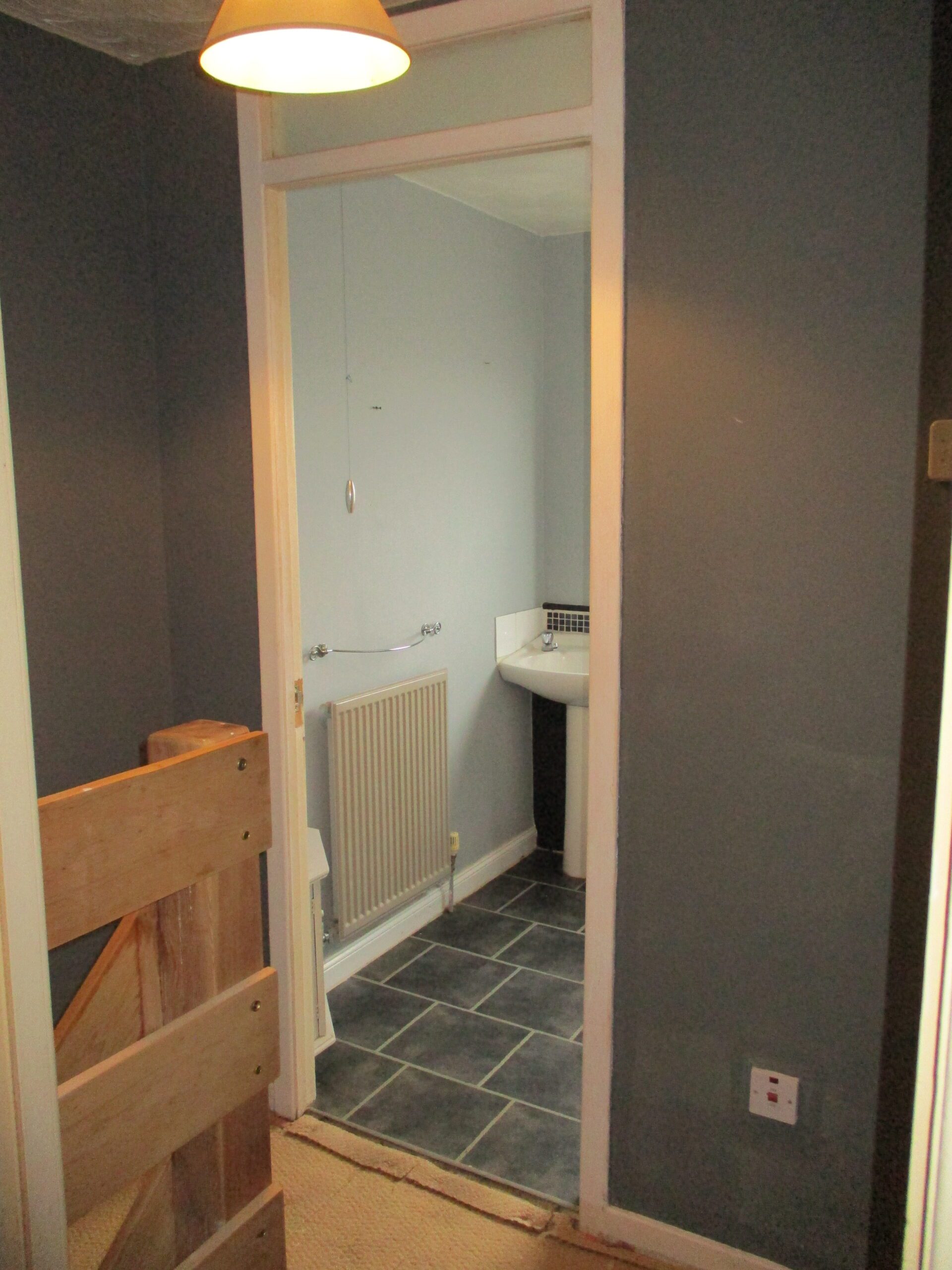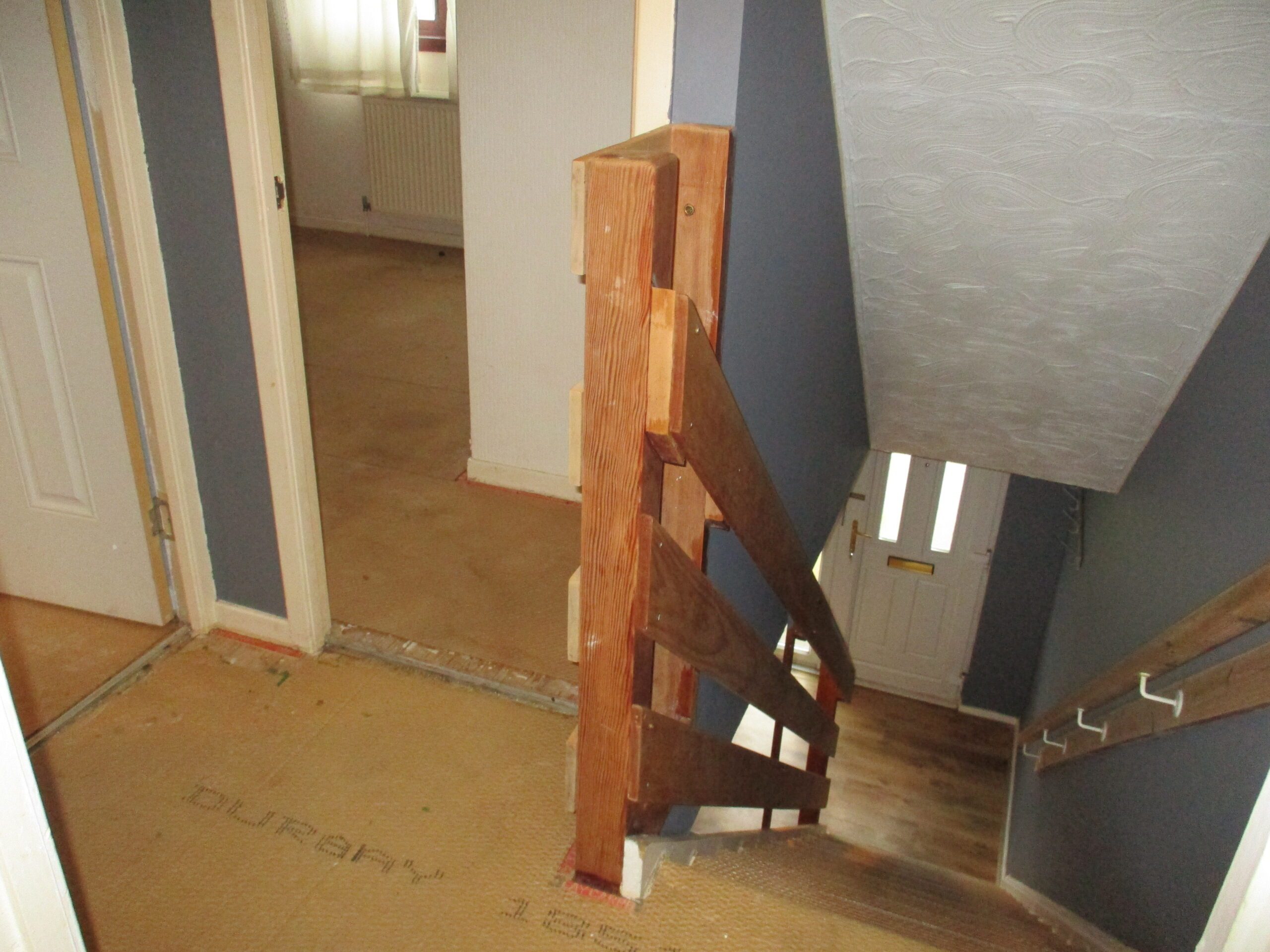 Handrail to one side. Smoke alarm. Hatch to insulated attic. Central heating thermostat. Doors of to two good-sized bedrooms and bathroom.