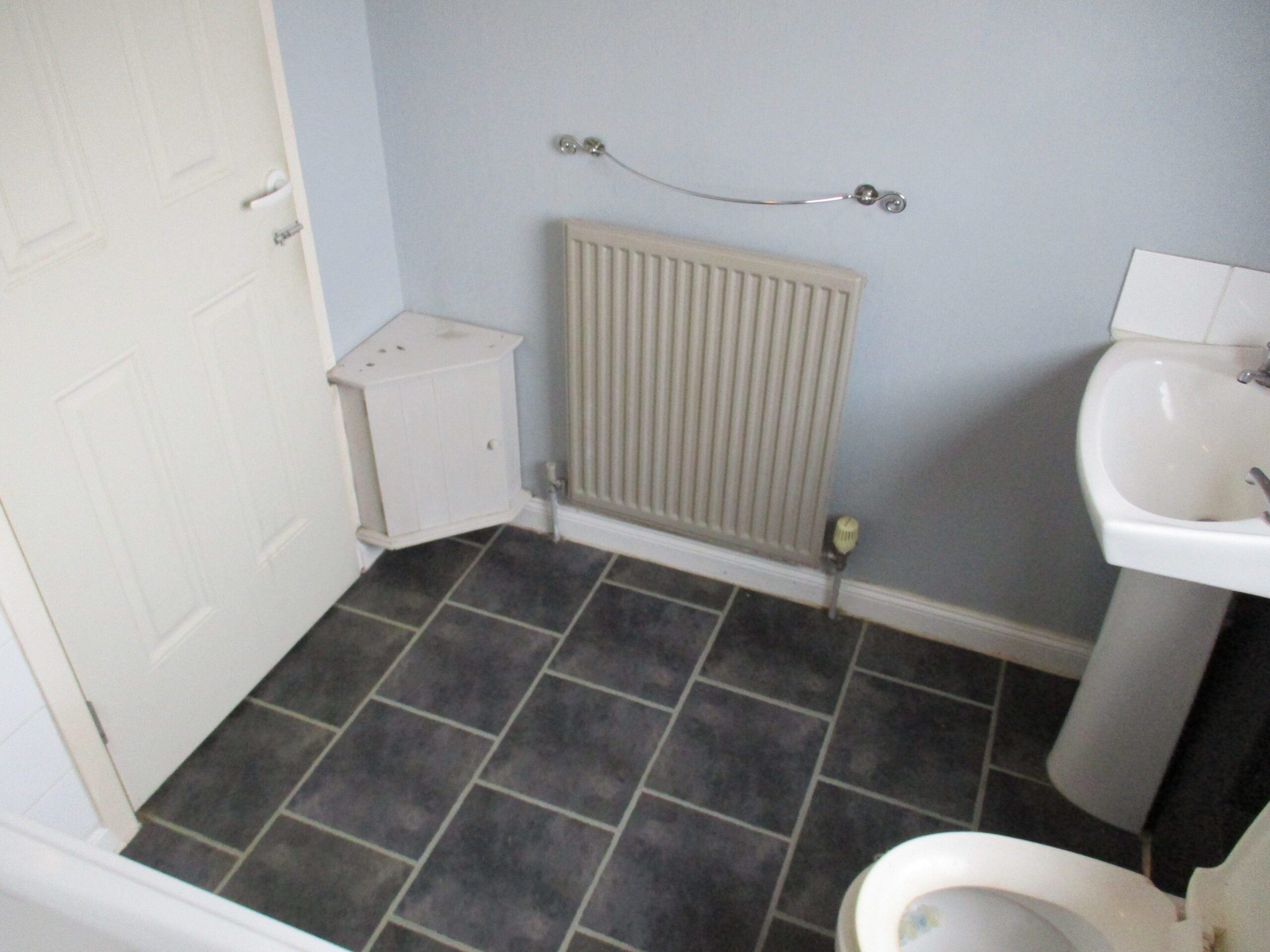 A white three-piece suite comprising bath, wash-hand basin and W.C. Dimplex shower over the bath. Partially tiled walls with flush ceiling light. There is an obscured double glazed window to the rear elevation. Extractor fan. Vinyl Flooring. Radiator with thermostatic valve.