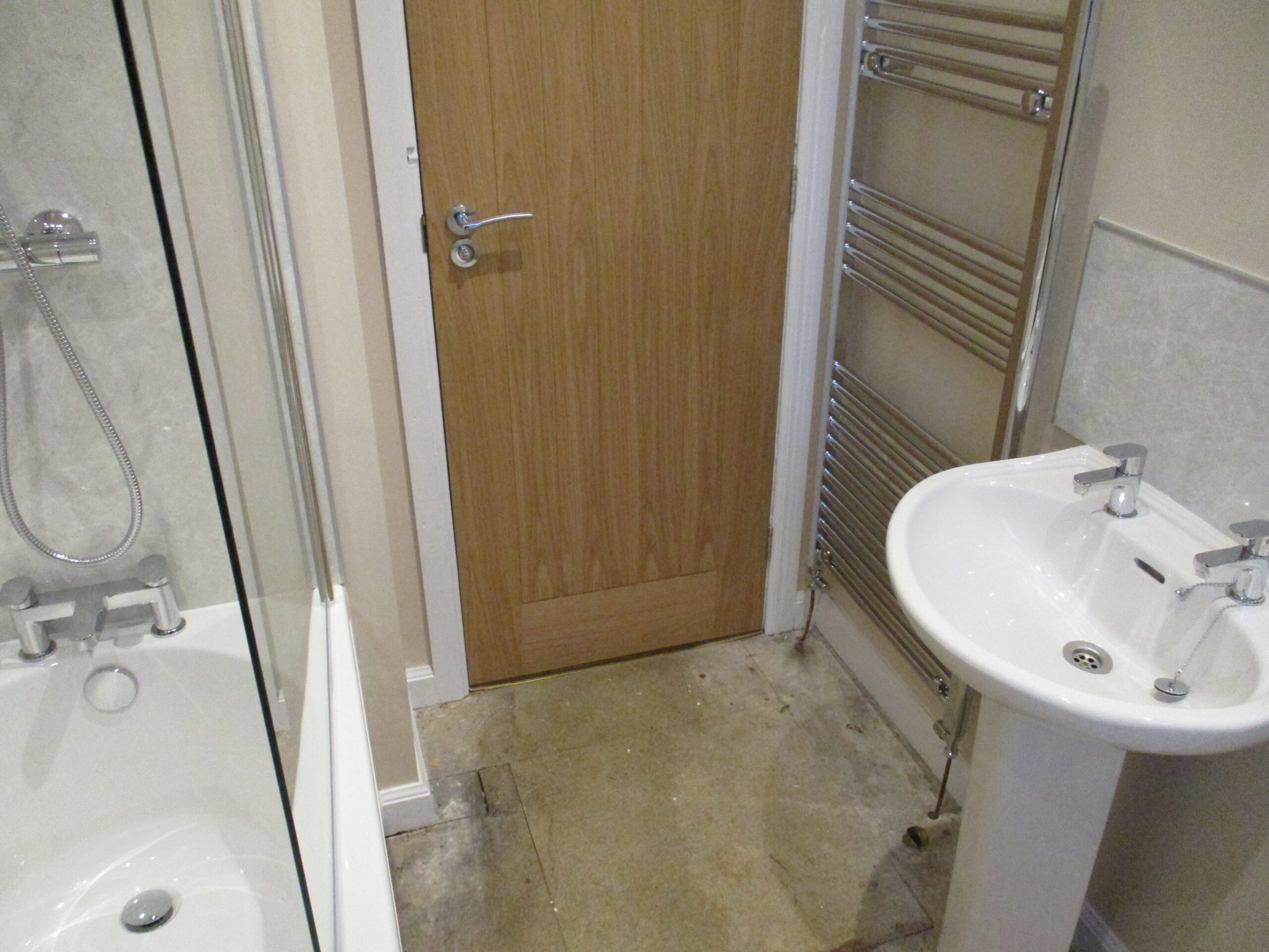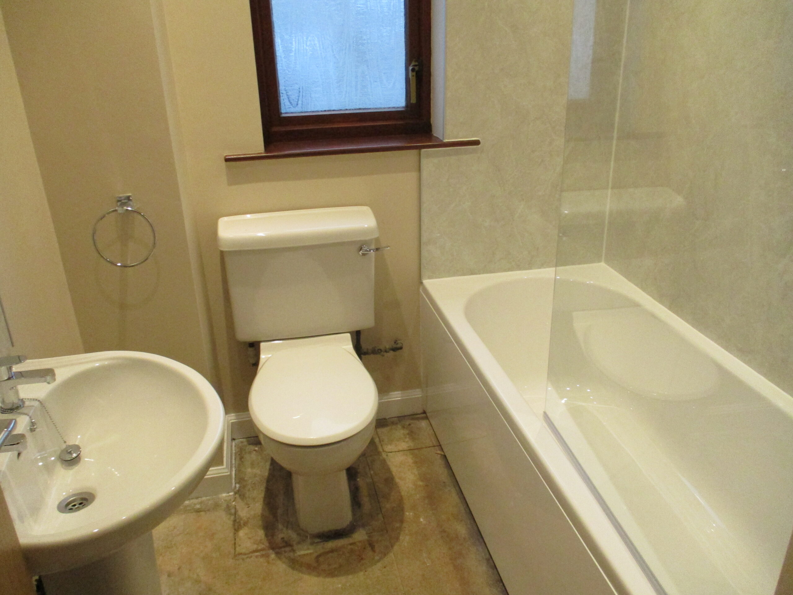 Modern white three piece suite comprising bath with chrome mixer taps, wash-hand basin and W.C. Shower over the bath with shower screen attached.  Waterproof wall boarding around bath and wash-hand basin.  Obscured double glazed window to the side elevation.  PVC ceiling with four inset ceiling spotlights.  Coving. Chrome heated towel rail.