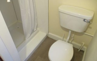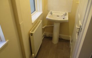 White wash-hand basin and W.C. Tiled splashback above wash-hand basin. Shower enclosure with Triton T80 electric shower. Extractor fan. Vinyl flooring. Radiator with thermostatic valve.