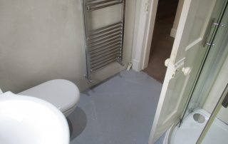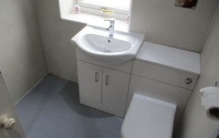 White wash-hand basin with chrome mixer tap and storage unit underneath. W.C. Corner shower cubicle with mixer shower. Waterproof wall boarding. Obscured double glazed window to the side elevation. Roller blind. Extractor fan. PVC ceiling with four inset ceiling spotlights. Vinyl flooring. Large chrome heated towel rail.