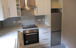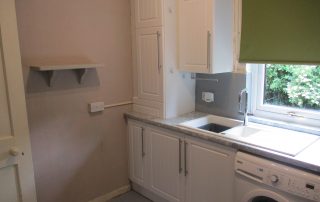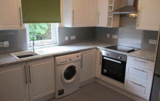 Modern kitchen with plentiful wall and base units incorporating a single drainer sink unit with vegetable compartment and chrome swan neck mixer taps. 4- Light chrome ceiling fitting. Built-in fan-assisted oven, hob, splashback and chrome chimney hood extractor. Plumbed for washing machine. Space for fridge/freezer. Double glazed window to the rear elevation. Roller blind. Vinyl flooring. Radiator with thermostatic valve.