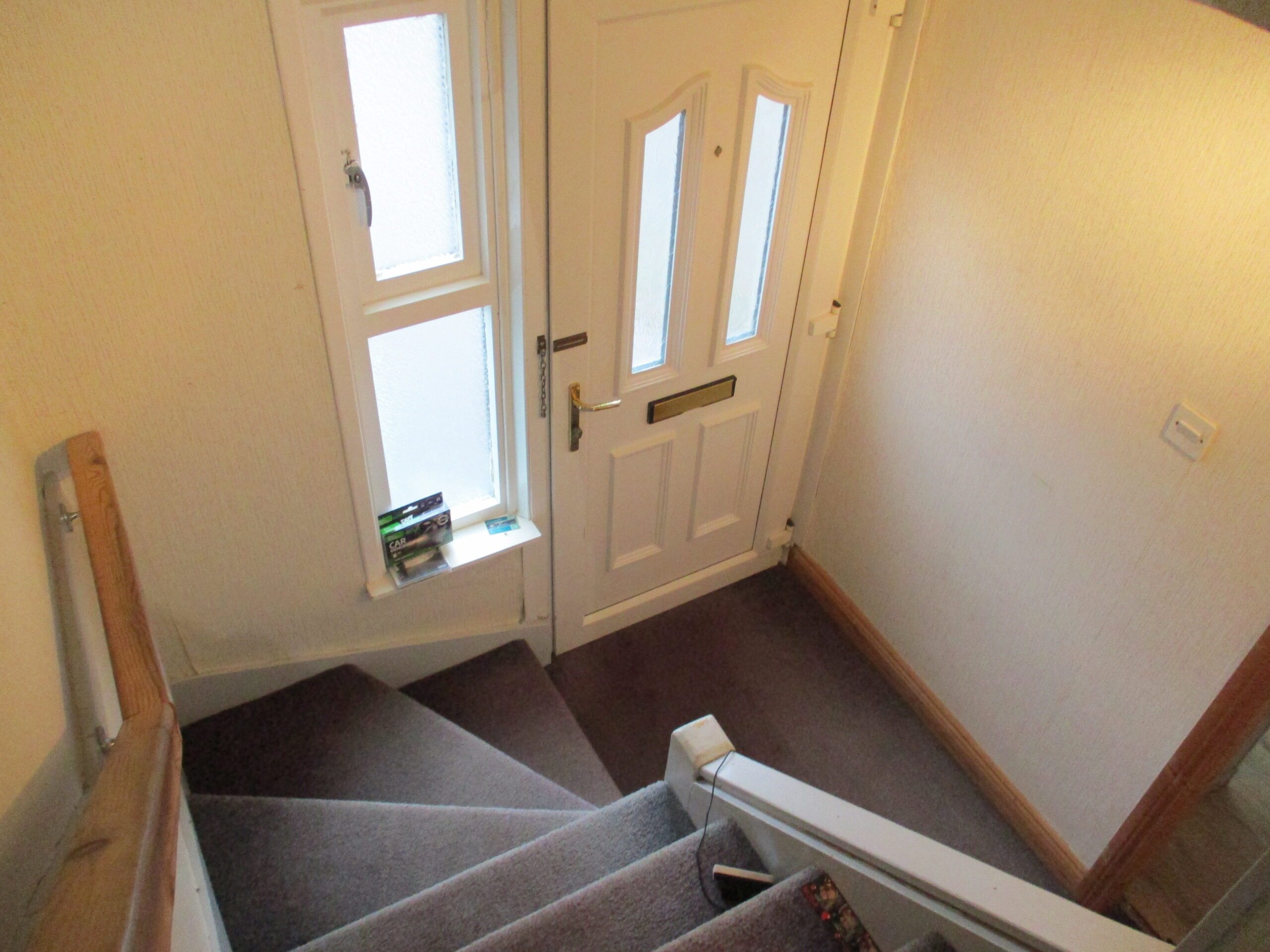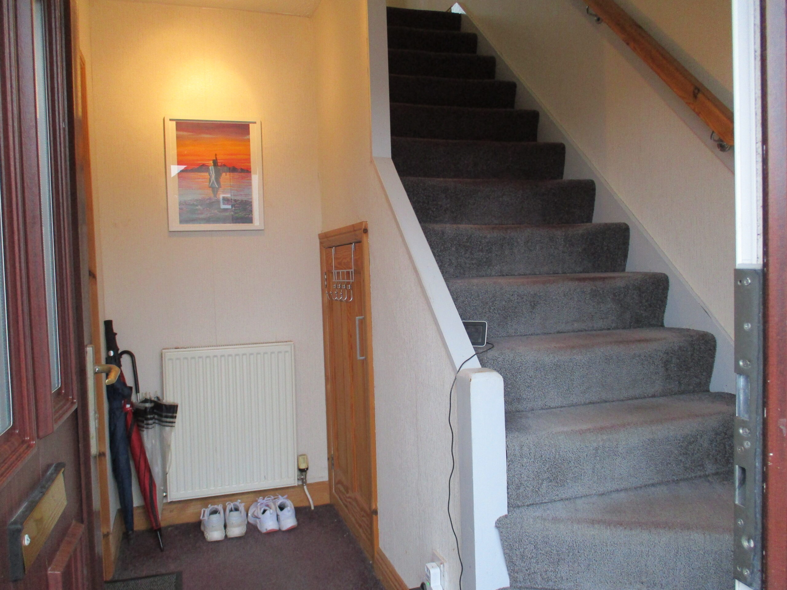 Entered through a part glazed U.P.V.C door with obscured side panel. Smoke alarm. Triple chrome spotlight ceiling fitting. Understairs storage cupboard (1.00m x 1.06m) housing the electricity meter and fusebox. Fitted carpet. Radiator with thermostatic valve. Glazed door through to the lounge.