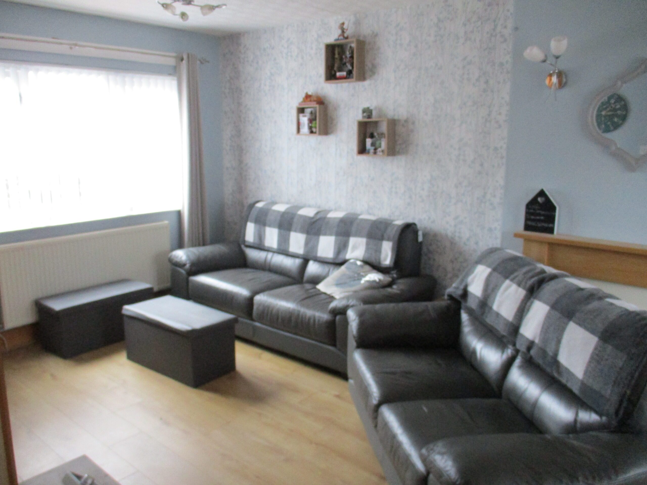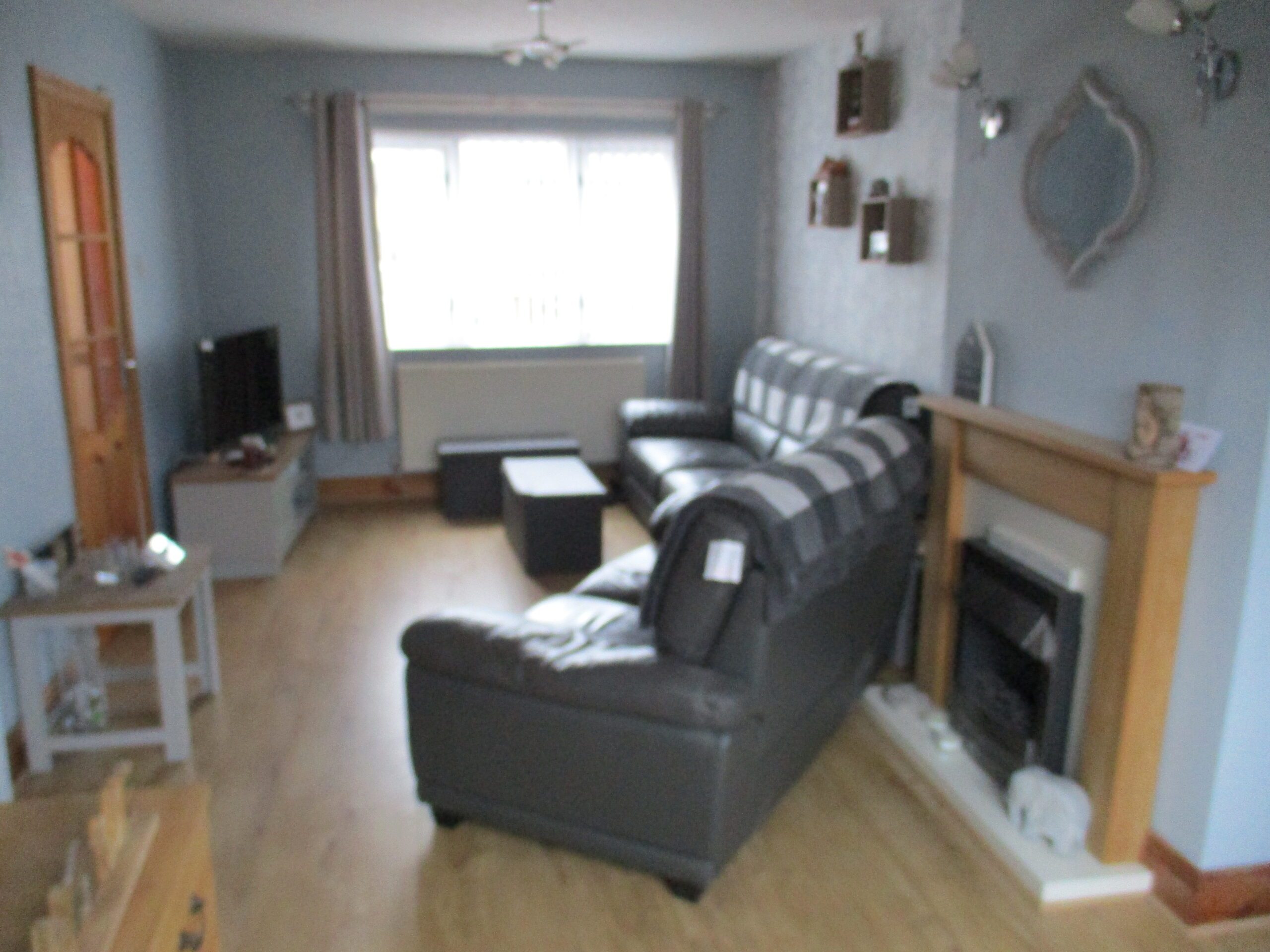Bright and spacious dual aspect room with double glazed windows to the front and rear elevations. Vertical blinds. Electric coal effect fire set within a wooden surround. Two chrome triple light fittings. Television point. Laminate flooring. Two radiators with thermostatic valves.