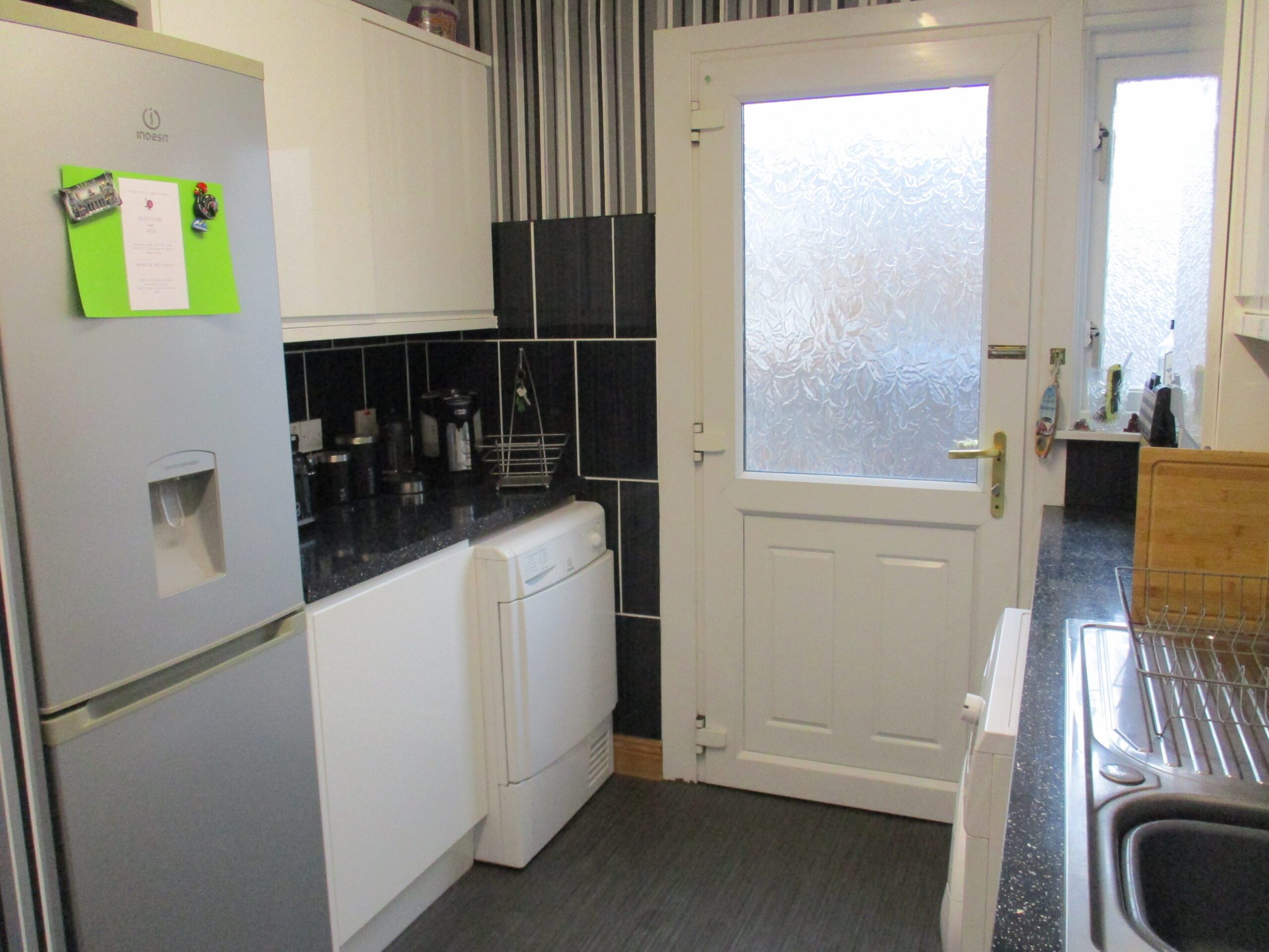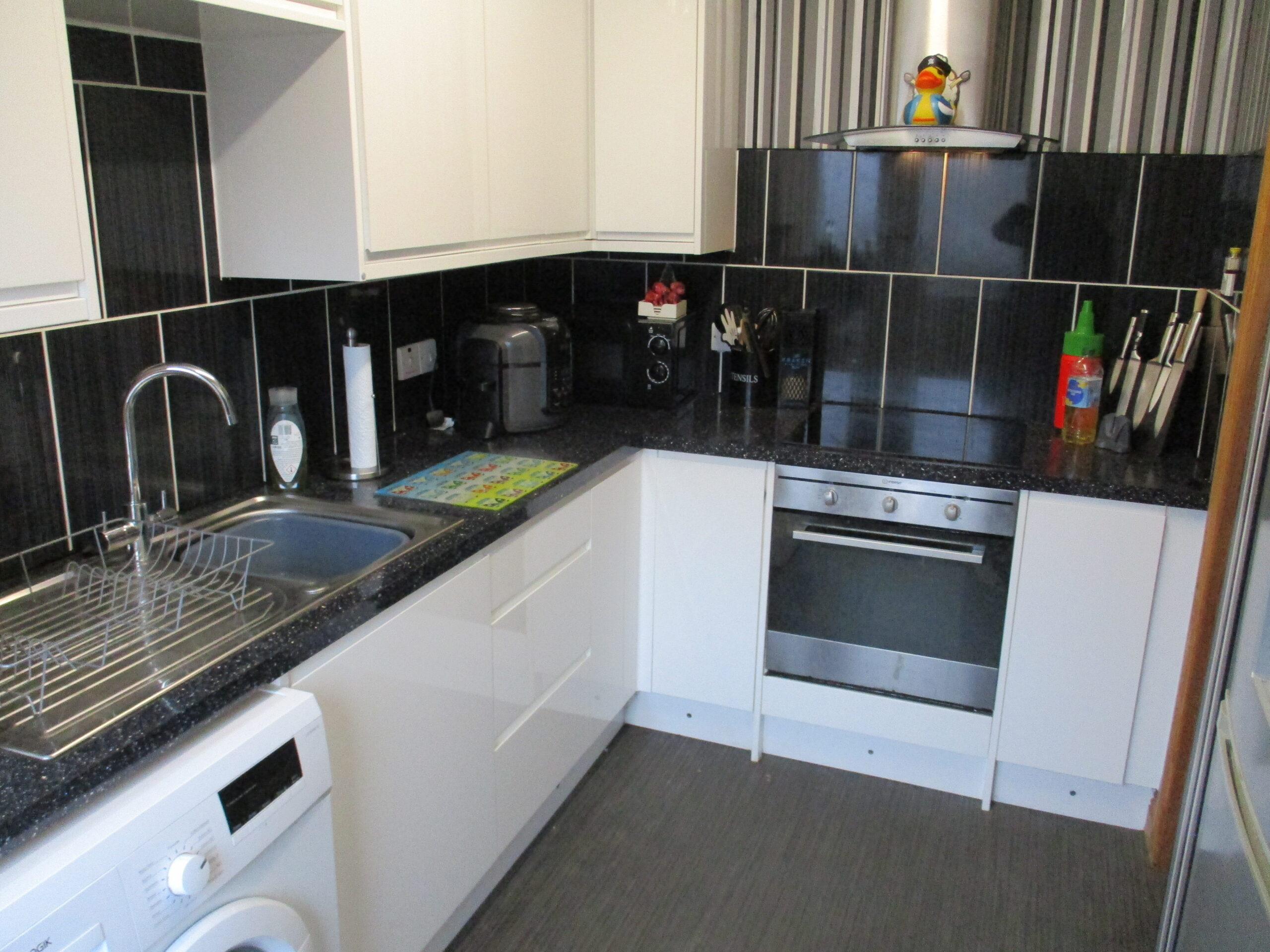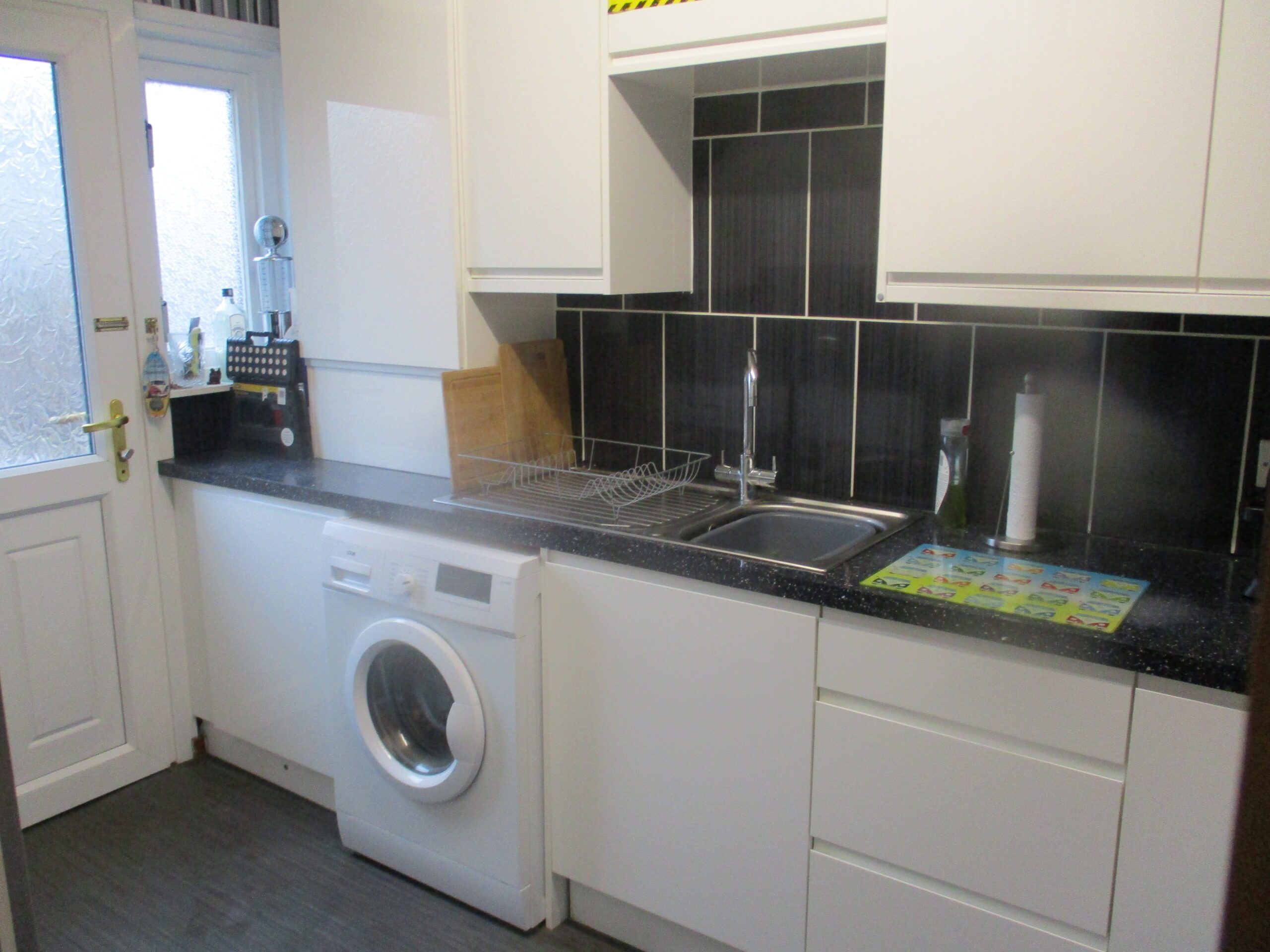 Contemporary designed white gloss wall and base units incorporating a single drainer sink unit with chrome mixer taps. One of the units conceals the Logic Ideal combi-boiler. Plumbed for washing machine. Built-in hob, fan-assisted oven and chrome chimney hood extractor. Space for tumble dryer and fridge/freezer. Smoke alarm. Ceiling striplight. Double glazed window to the rear elevation. Vertical blinds. Tiled splashbacks. Vinyl flooring. U.P.V.C part glazed rear door.