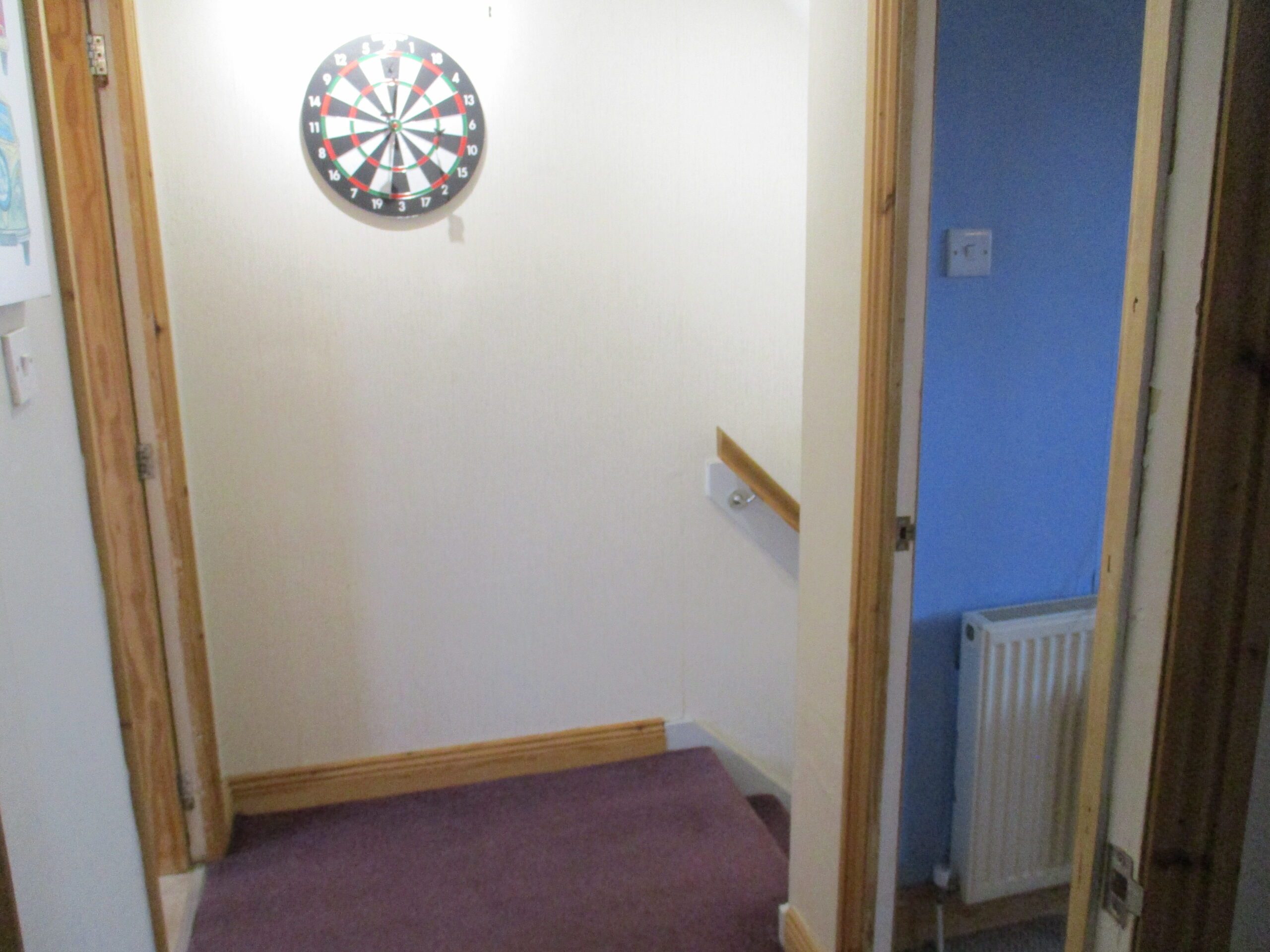 Handrail to one side. Hatch with ladder attached to insulated attic. Triple chrome ceiling spotlight fitting. Smoke alarm. Fitted carpet. Doors off to two bedrooms and bathroom.