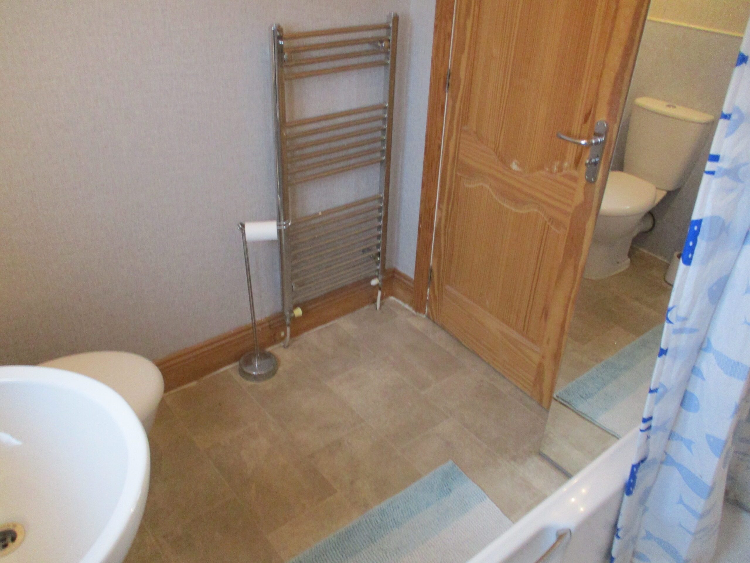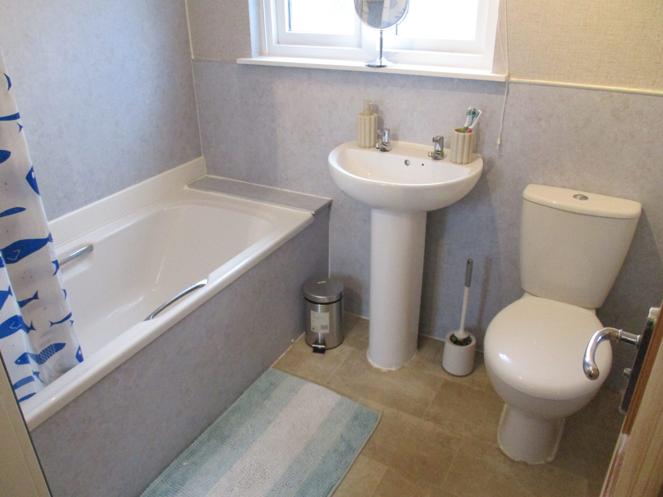 White three piece suite comprising bath with Mira sport shower, wash-hand basin and W.C. Triple spotlight ceiling fitting. Xpelair. Obscured double glazed window to the rear elevation. Venetian blinds. Vinyl flooring. Radiator.