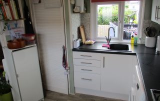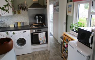 White high gloss wall and base units incorporating a singer drainer sink unit with chrome swan neck mixer taps. Built-in 4-ring gas hob, fan-assisted oven and chrome cooker hood extractor. Bosch serie 2 washing machine and Beko small freezer included in sale. Extractor fan. Double-glazed windows to either side. Tiled splashbacks. Radiator with thermostatic valve. New vinyl flooring. Cupboard housing the Worcester condensing-combi boiler. Space for fridge/freezer. Free standing shelved storage unit. Roller blinds.
