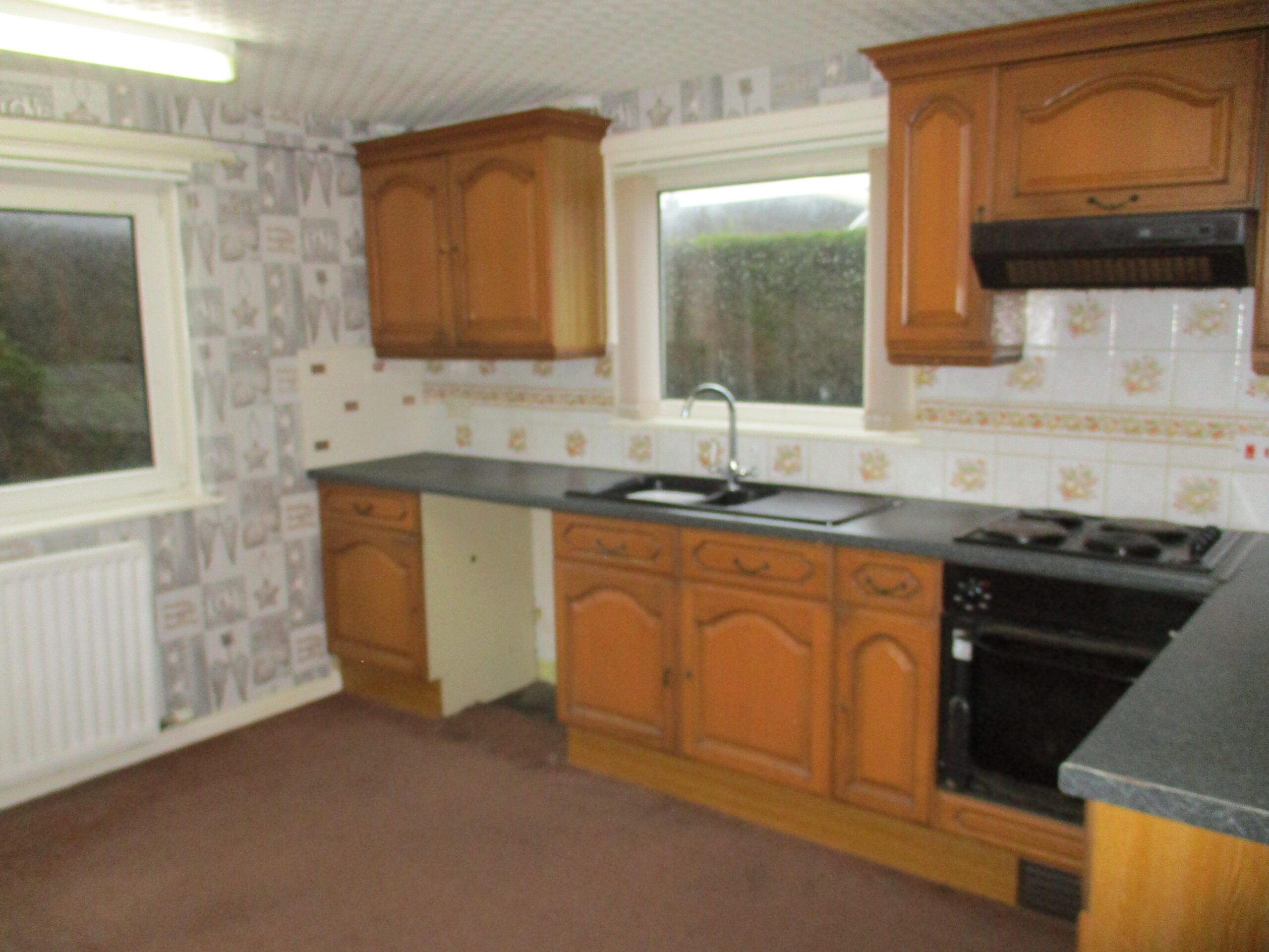 There are wall and base units incorporating a single drainer sink unit with vegetable compartment and chrome swan neck mixer taps. Two ceiling strip lights. The walls are partially tiled. Plumbed for washing machine. Space for fridge/freezer. Electric hob, oven and cooker hood extractor. Double glazed windows to the front and side elevations. Radiator with thermostatic valve. Part glazed timber framed door through to the rear vestibule.