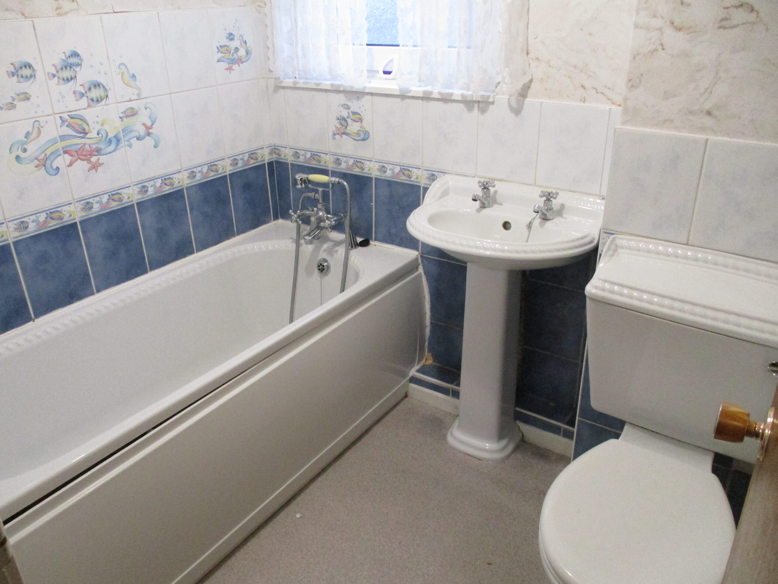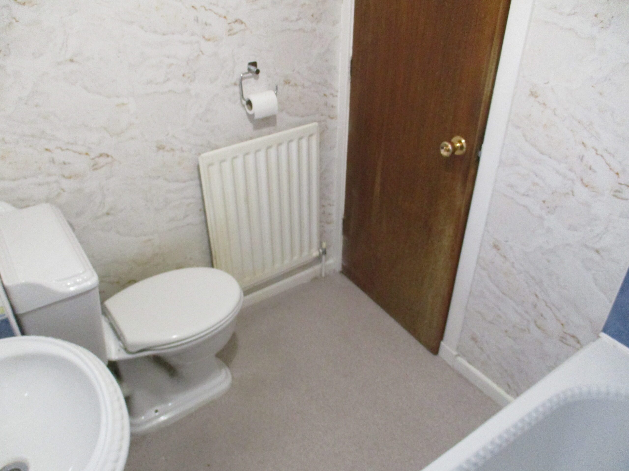 This is a white three-piece suite comprising of both bath and shower with mixer taps, wash hand basin and W.C. The walls are partially tiled. There is an obscured double-glazed window to the side elevation. Voiles. Vinyl flooring. Radiator.