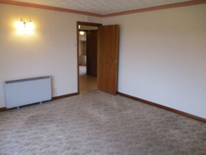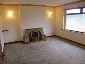 A lovely bright room with double glazed window to the front elevation. Vertical blinds. Electric coal fire set within an ornamental fire surround. Double wall light and two single wall lights. Double dimmer switch. Coving. Television point. Fitted carpet. Electric storage heater.