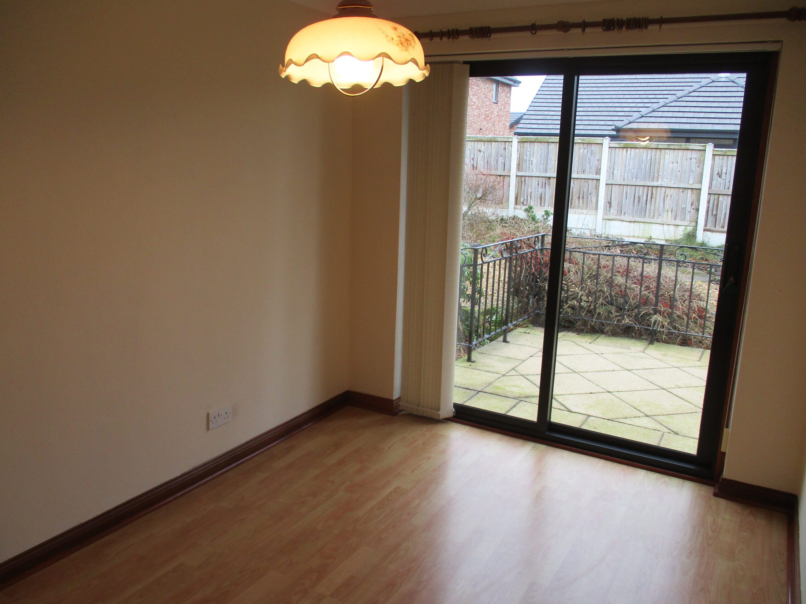 Double glazed sliding patio doors giving access to the rear garden. Vertical blinds. Pull down ceiling light. Coving. Laminate flooring. Electric storage heater. Door through the fitted kitchen.